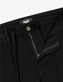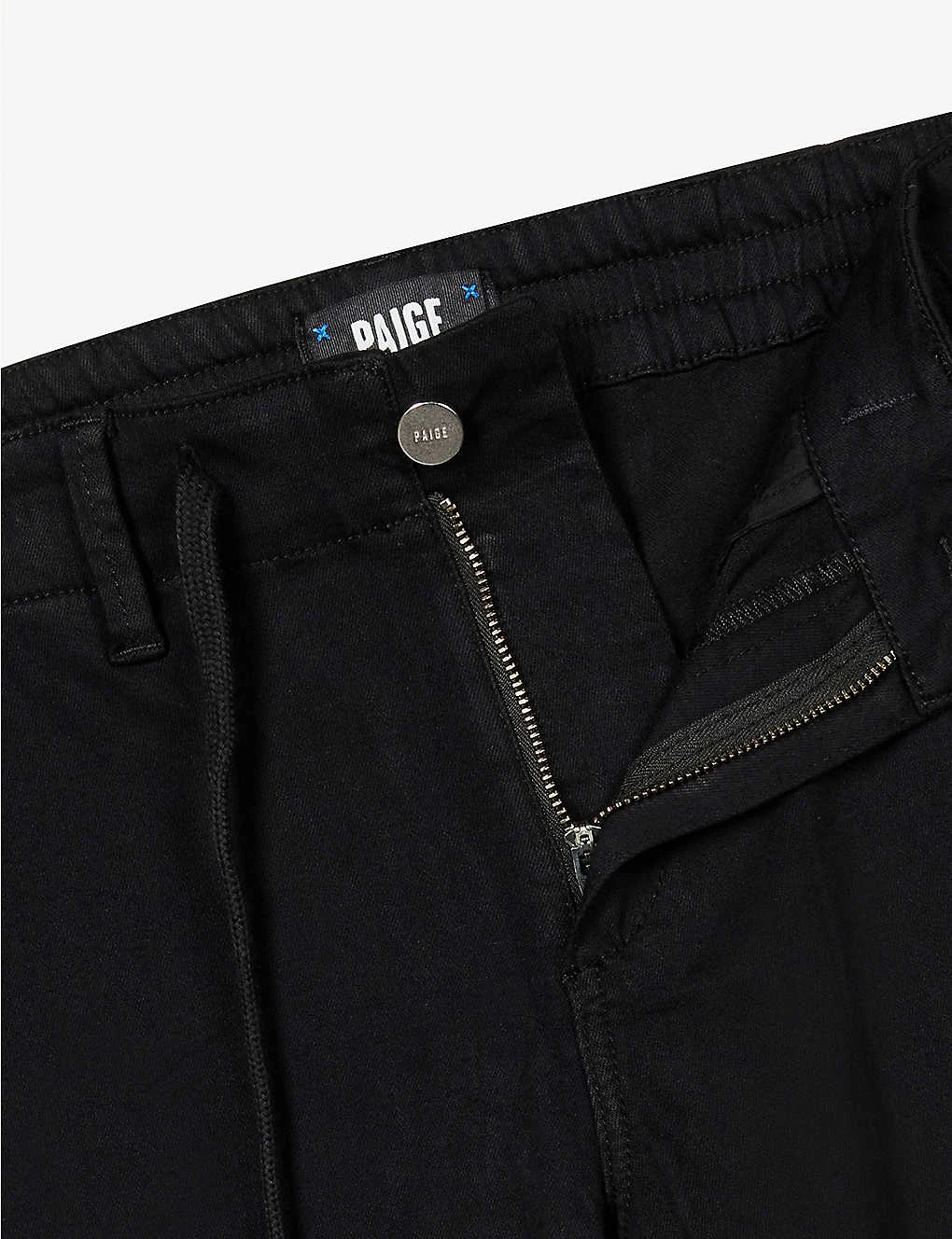 - Slim fit, high rise, tapered leg, belt loops, five pockets, straight cuffs