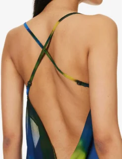 - Slim fit, cowl neck, adjustable crossover straps, semi-sheer, low back, all-over abstract pattern
