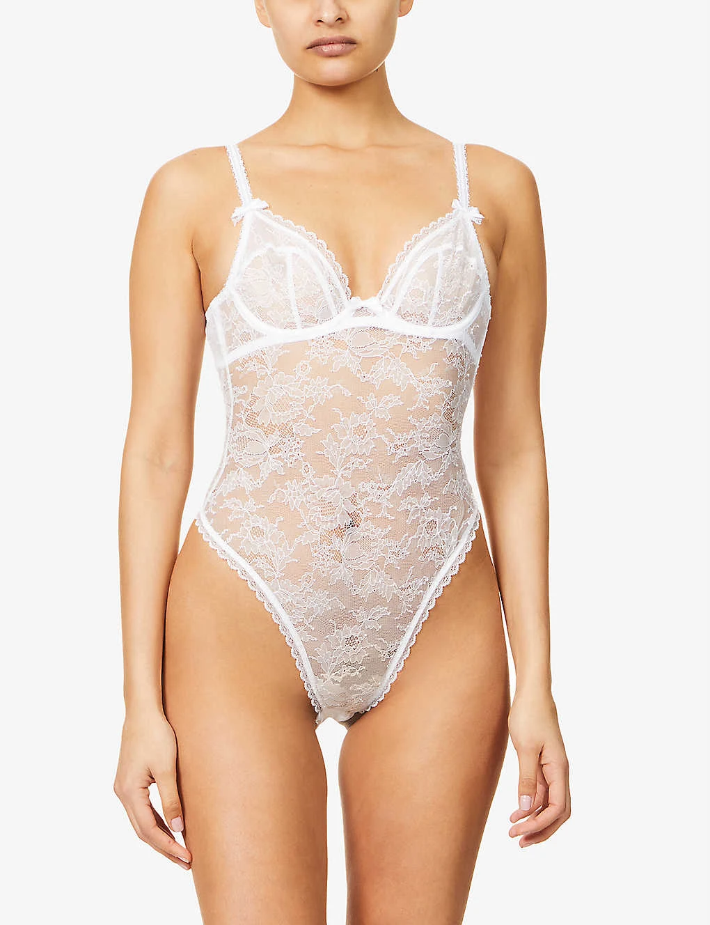 - V-neck, adjustable spaghetti straps, bow at cups, underwired cups, sheer, all-over embroidered floral lace, cut out at back, high leg, V-string at back, frilled trims