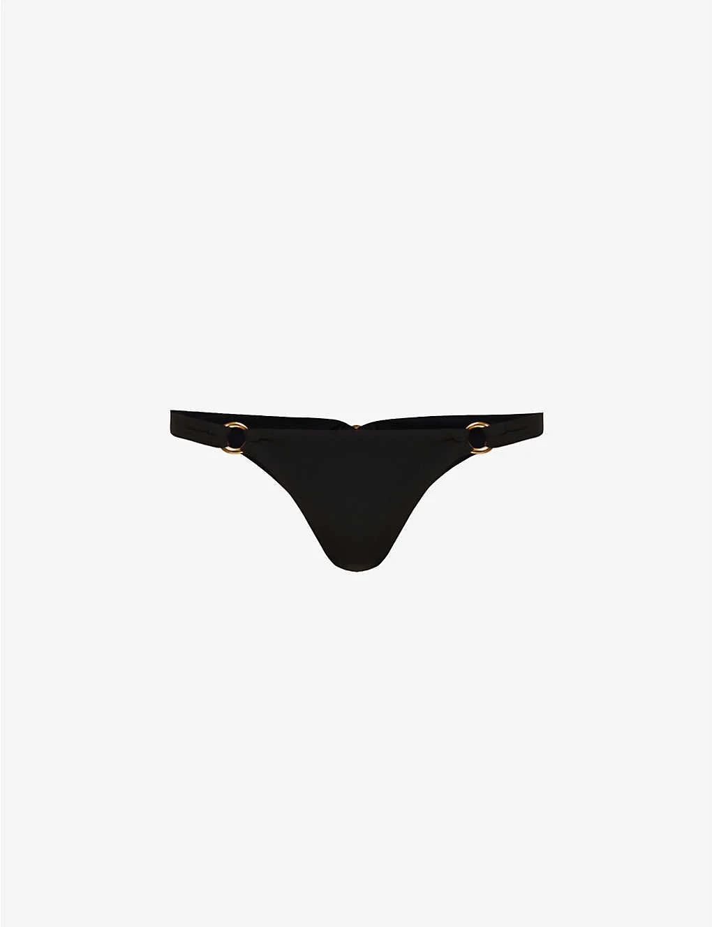 - Mid-rise, elasticated waistband, cut-out at front, gold-toned hardware, slight-coverage at back, fully lined