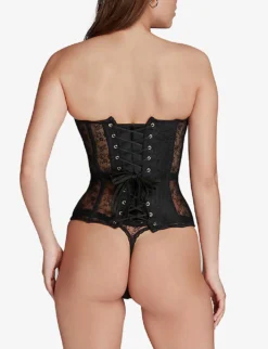 - Sweetheart neckline, strapless, underwired, lace and mesh panels, interior boning, lace up detail at back