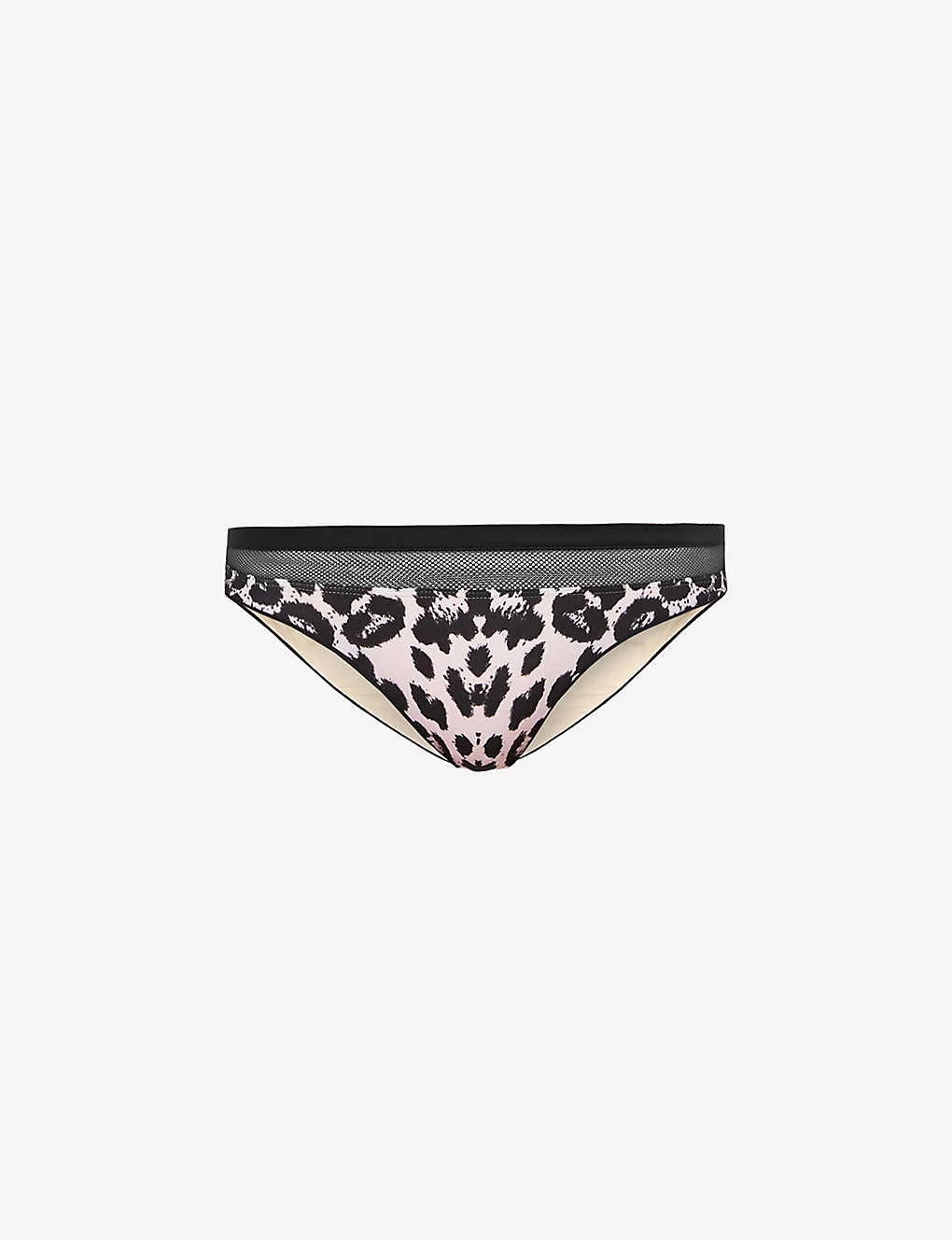 - Mid rise, elasticated waistband, mesh inset at waist, all-over leopard print, medium coverage at back, fully lined