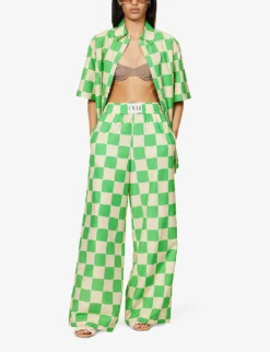 - Relaxed fit, high rise, branded elasticated waistband, wide leg, two slip pockets at sides, all-over check pattern