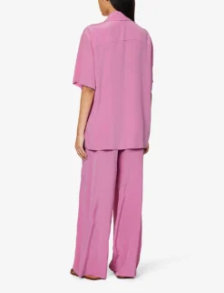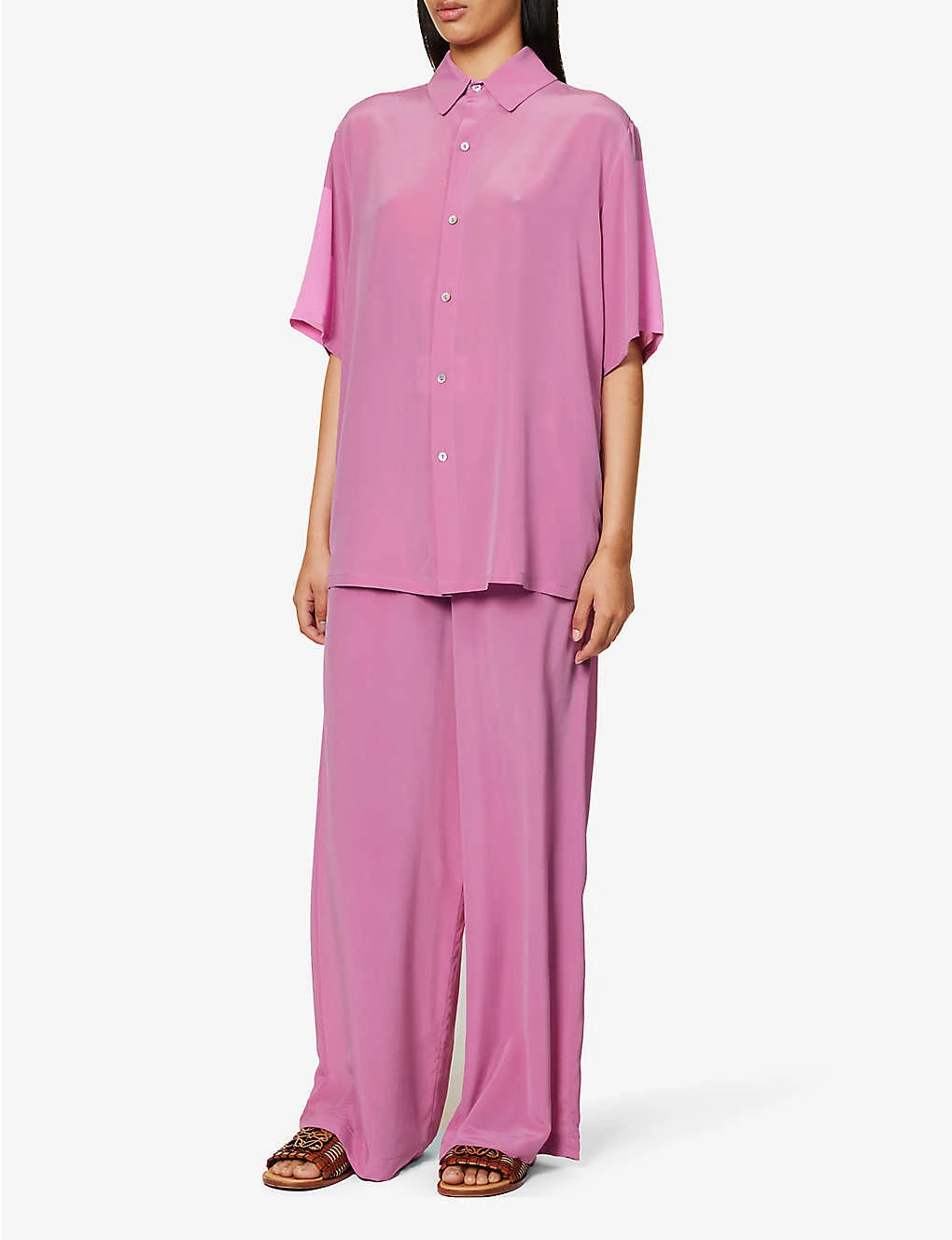 - Relaxed fit, collar, long sleeves, buttoned and pleated cuffs, pearlescent branded buttons, crepe texture