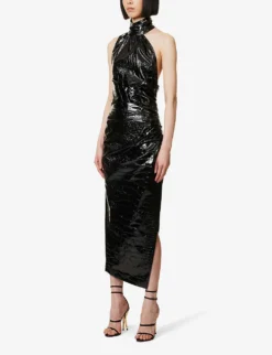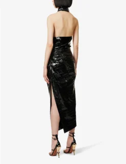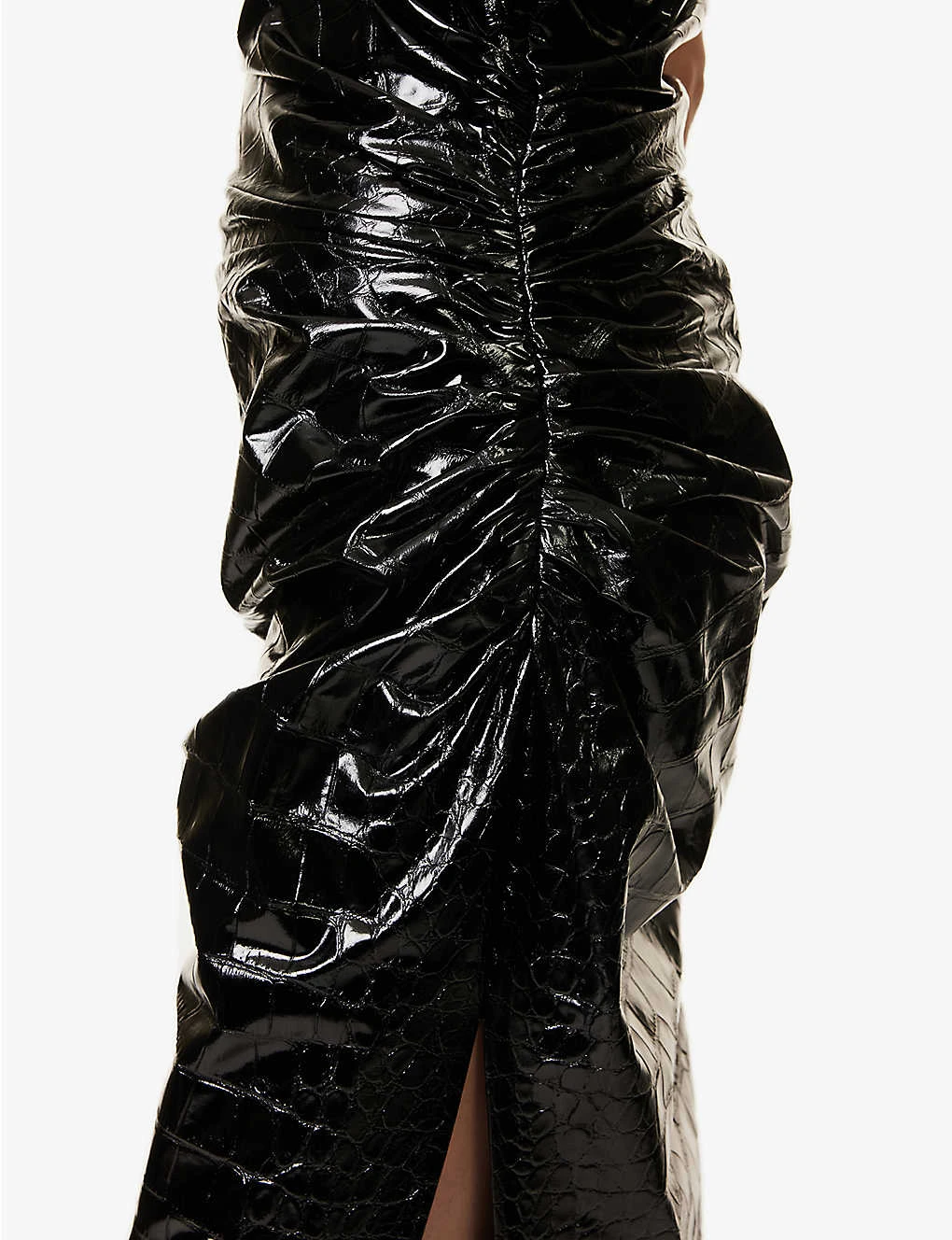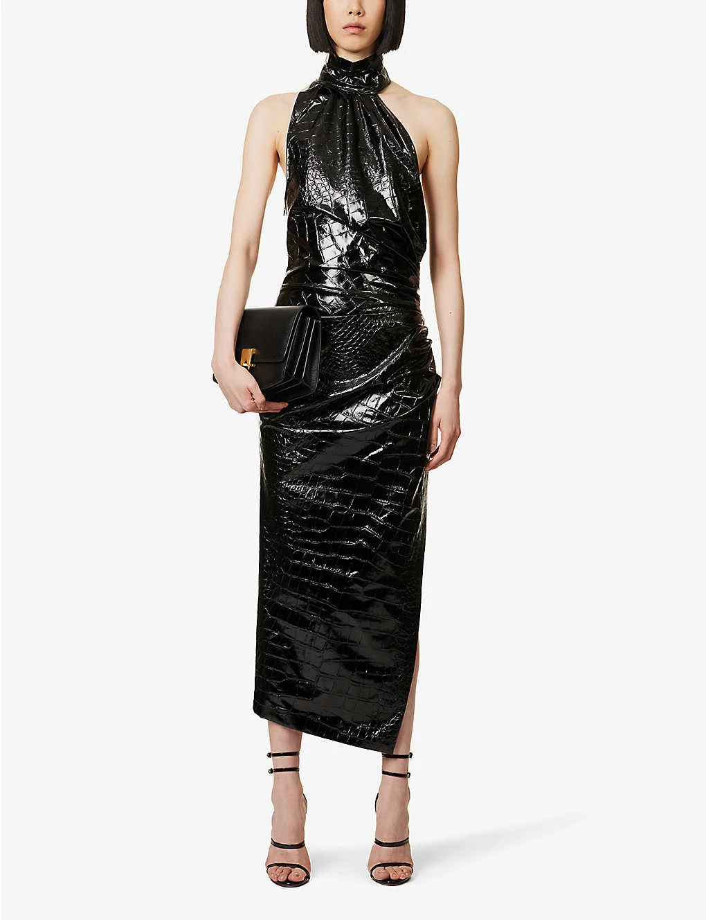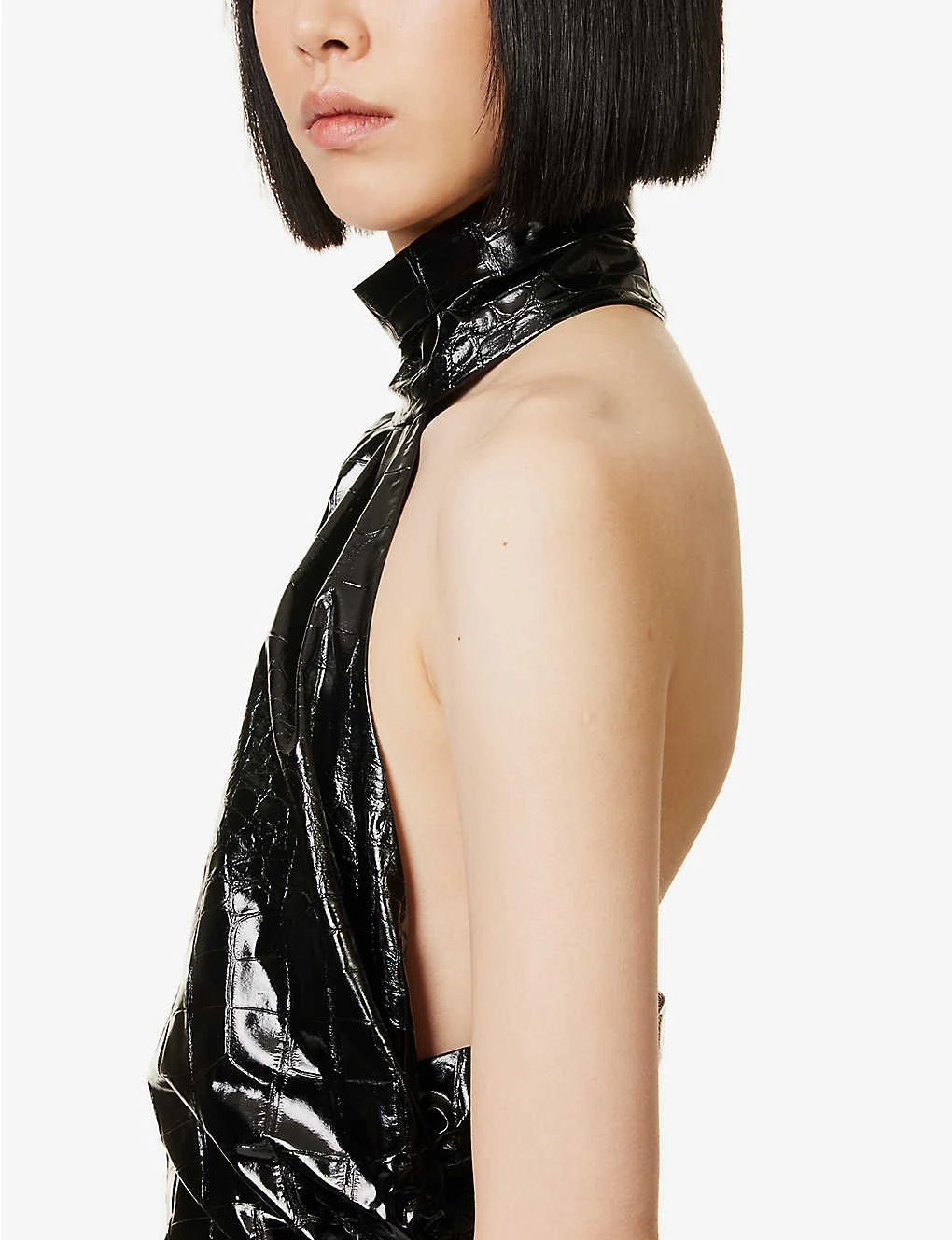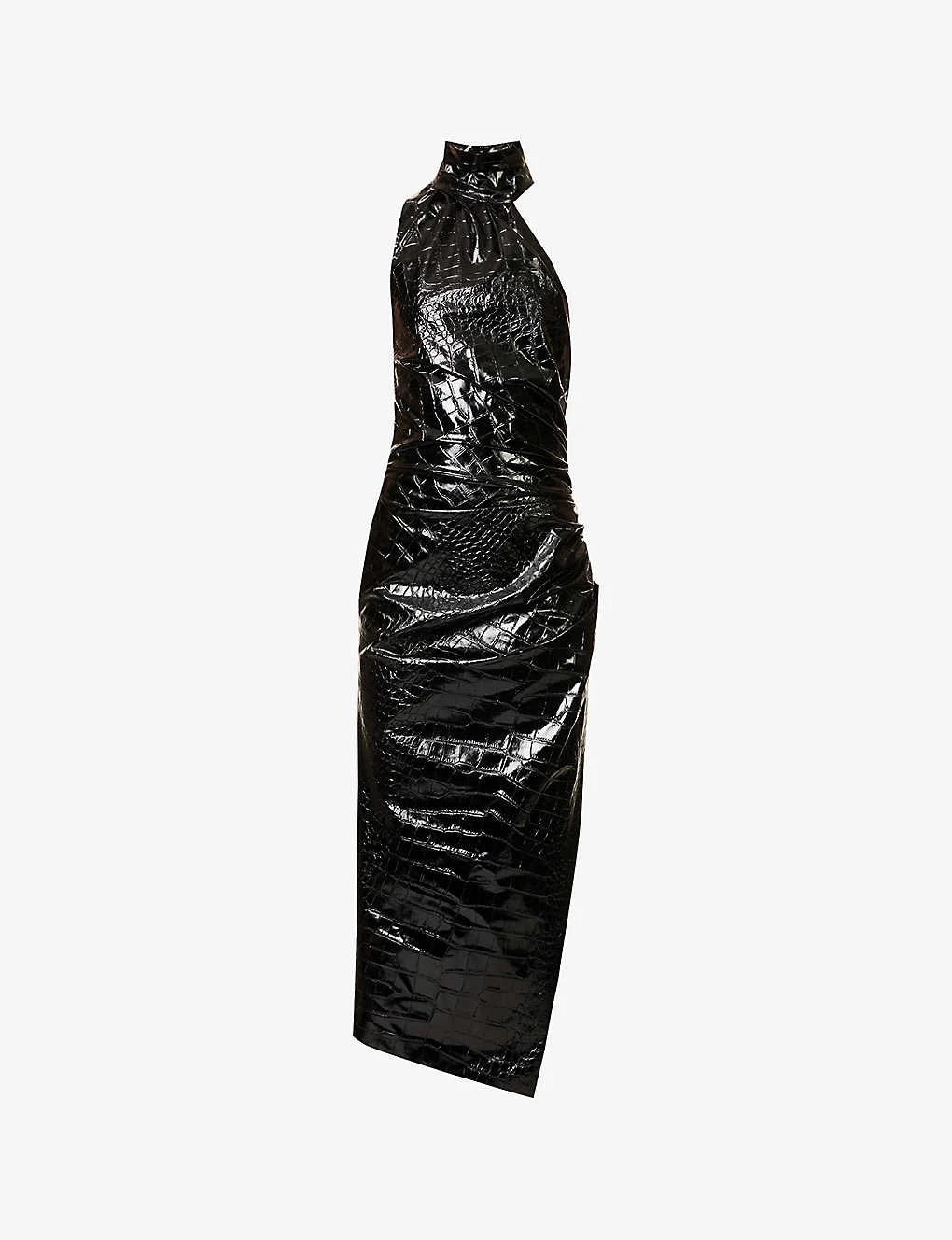 - Slim fit, halterneck, sleeveless, open back, ruched pattern at sides, all-over embossed croc effect, patent finish, asymmetric split hem