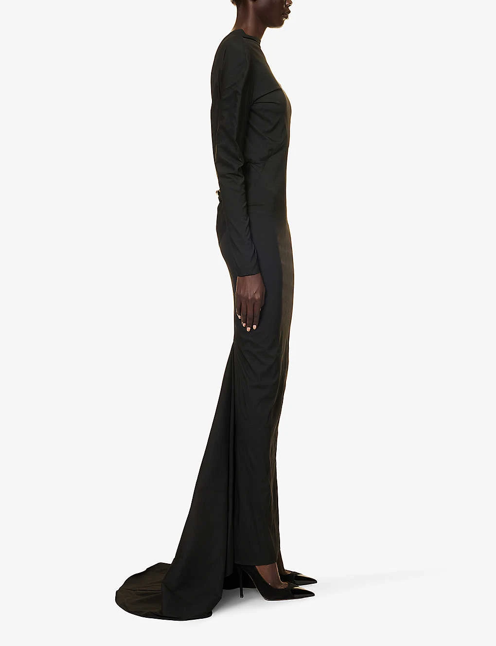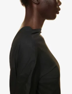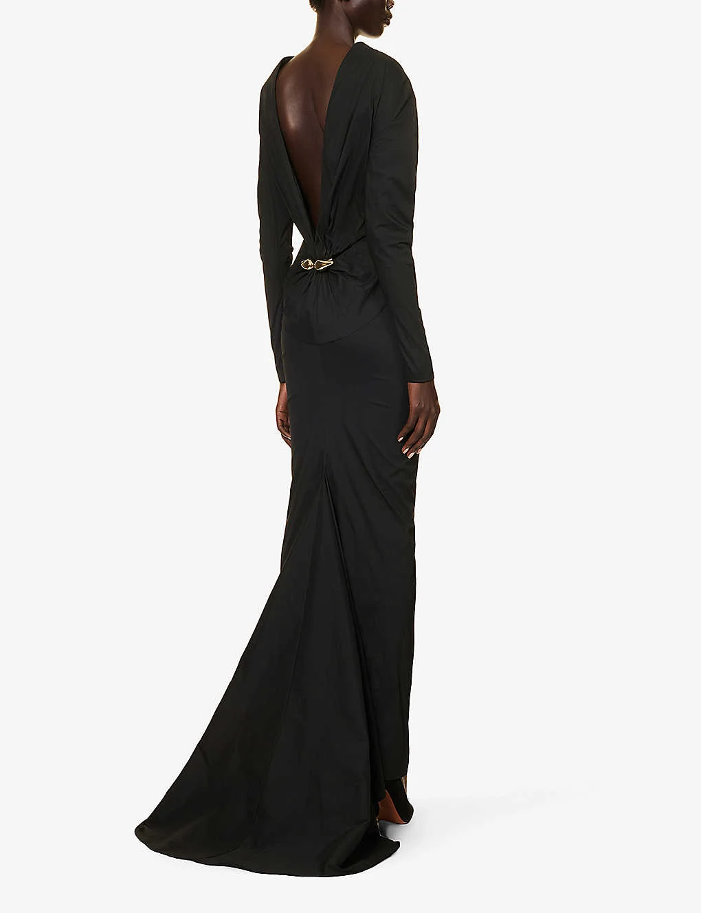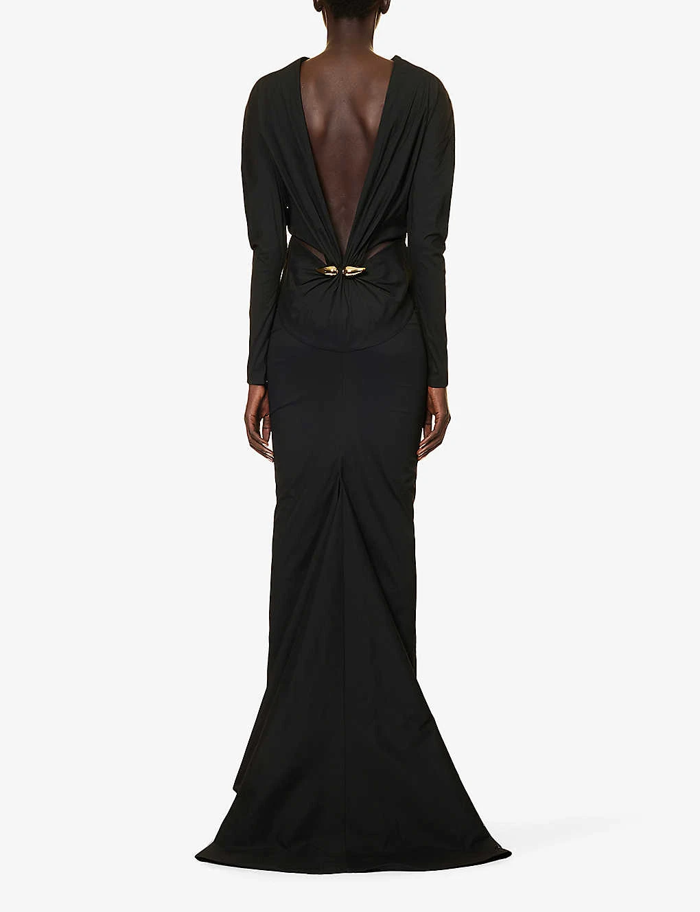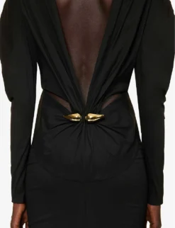 - Slim fit, pencil shape, round neck, long sleeves, straight cuffs, darts at front, open and ruched at back, gold-toned hardware embellishment and pleated panel at back, straight hem