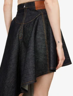 - Regular-fit, high-waist, structured waistband, contrast stitching, asymmetric skirt, all-over faded wash, debossed brand patch at back, curved yoke at back, flared hem