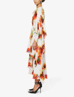 Alexander McQueen Asymmetric-hem Ruffle-trim Silk Midi Dress