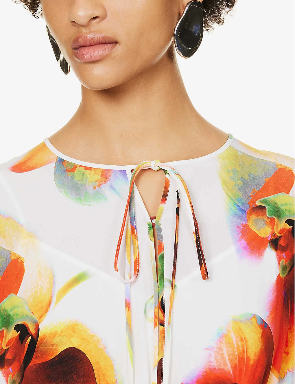 - Regular fit, round neckline, self-tie at neckline, long flutter sleeves, keyhole at front, structured gathered waist, floral pattern, ruffled asymmetric hem
