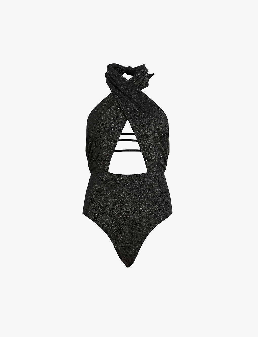 - Halter neck, adjustable neckties, cut-out detail at front, open back, branded hardware at back, all-over shimmer fabrication, medium coverage
