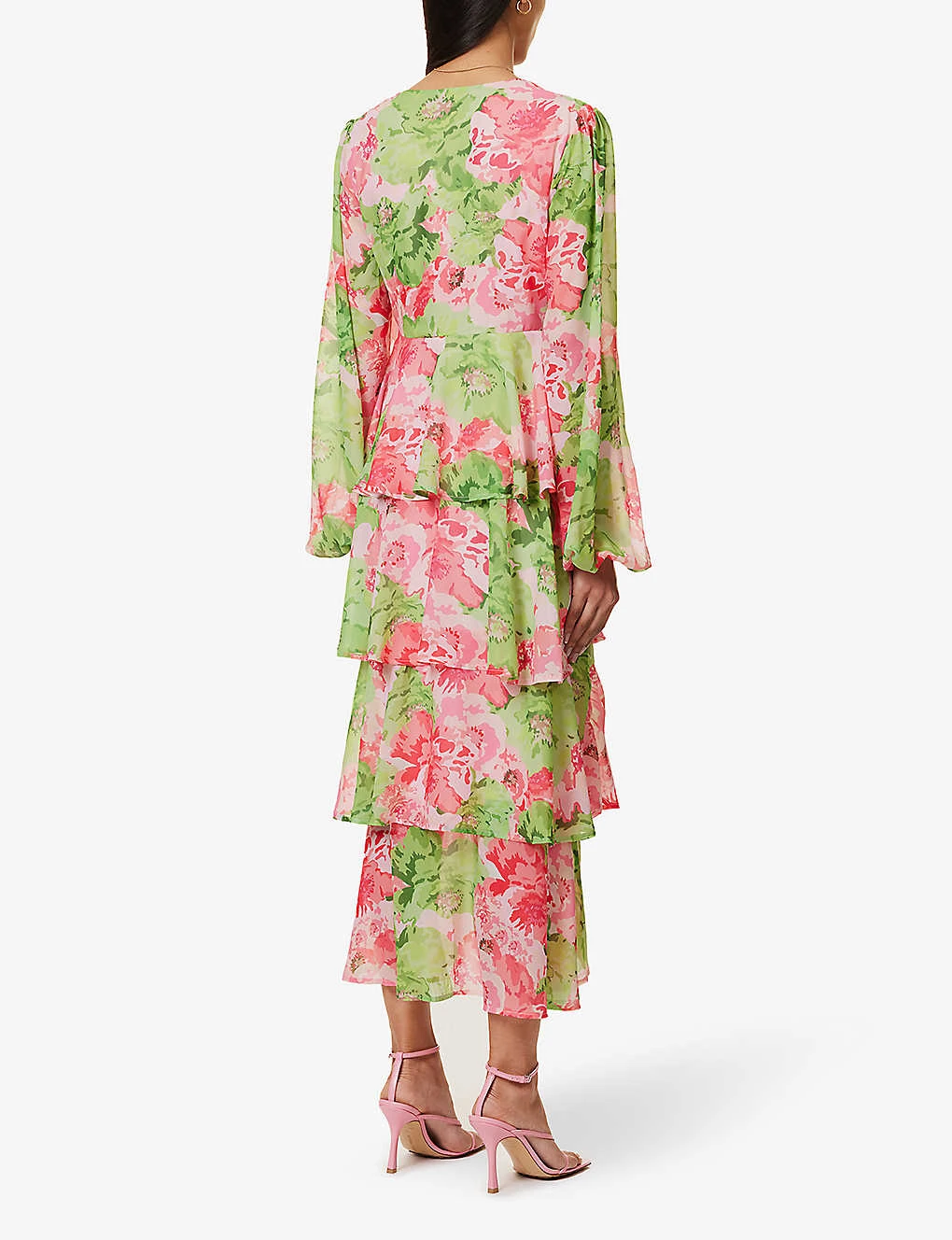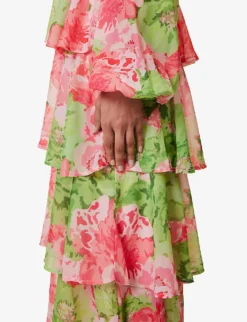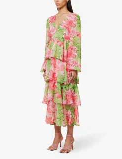 - Regular fit, plunging V-neck, long puff sleeves, elasticated cuffs, tiered and frilled skirt, all-over floral pattern, dipped hem at back, partially lined