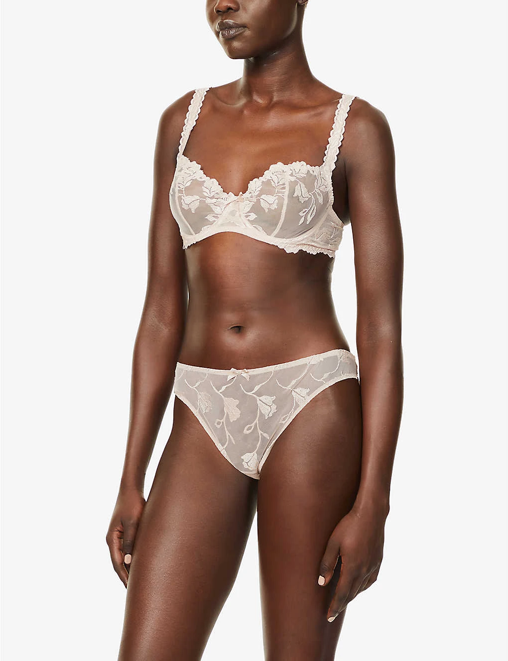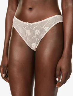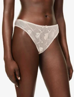 - Mid rise, elasticated waistband, bow at front, semi-sheer panel at front with floral design, semi-sheer mesh panels at back, lined gusset, slight-coverage at back