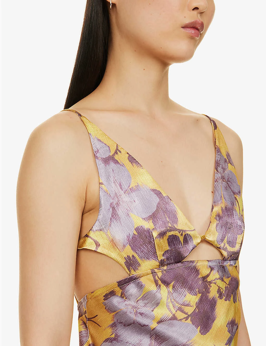 - Slim fit, plunge V-neckline, sleeveless, self-tie straps, cut-out panel at waist, open strappy back, floral pattern, flared hem