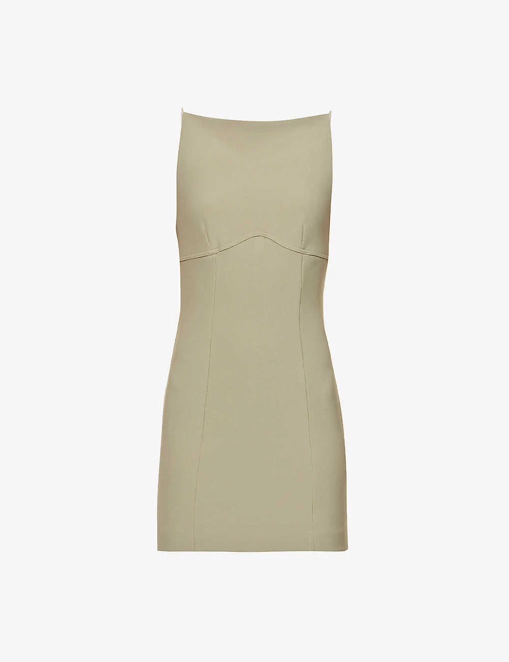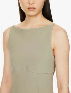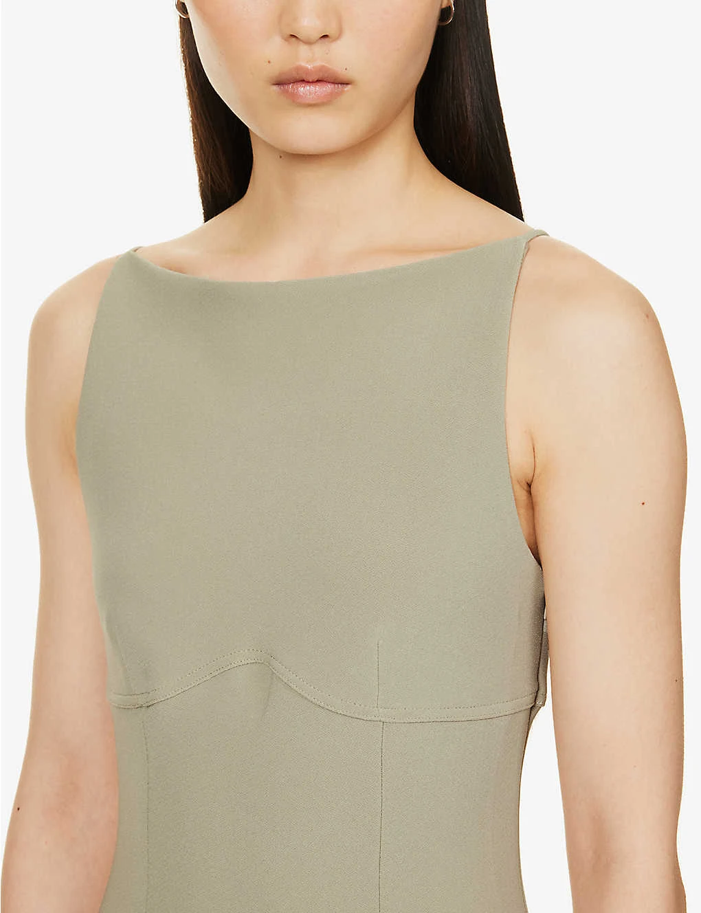- Slim fit, square neckline, sleeveless, darts at chest, panelled pattern, crepe texture