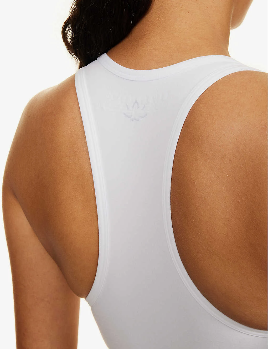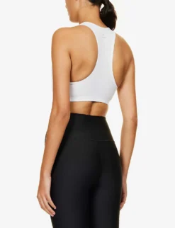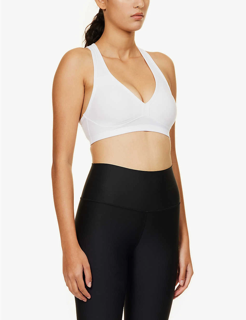 - Fitted, V-neck, shoulder straps, racerback, detachable cups, elasticated under-band, branding at back, fully lined