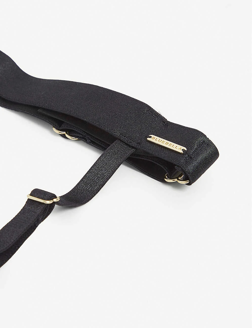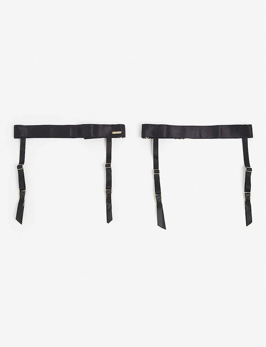 - Adjustable leg band, gold-tone hardware, ribbon details, engraved branded tab
