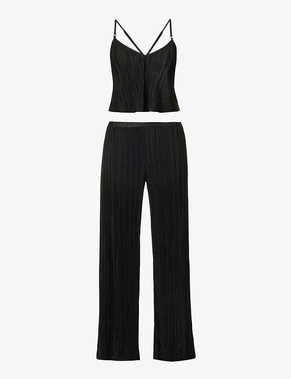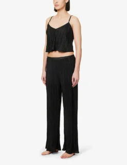 - Regular-fit, V-neck, adjustable shoulder straps, gold-toned hardware, all-over plissé texture, metallic brand plaque at back