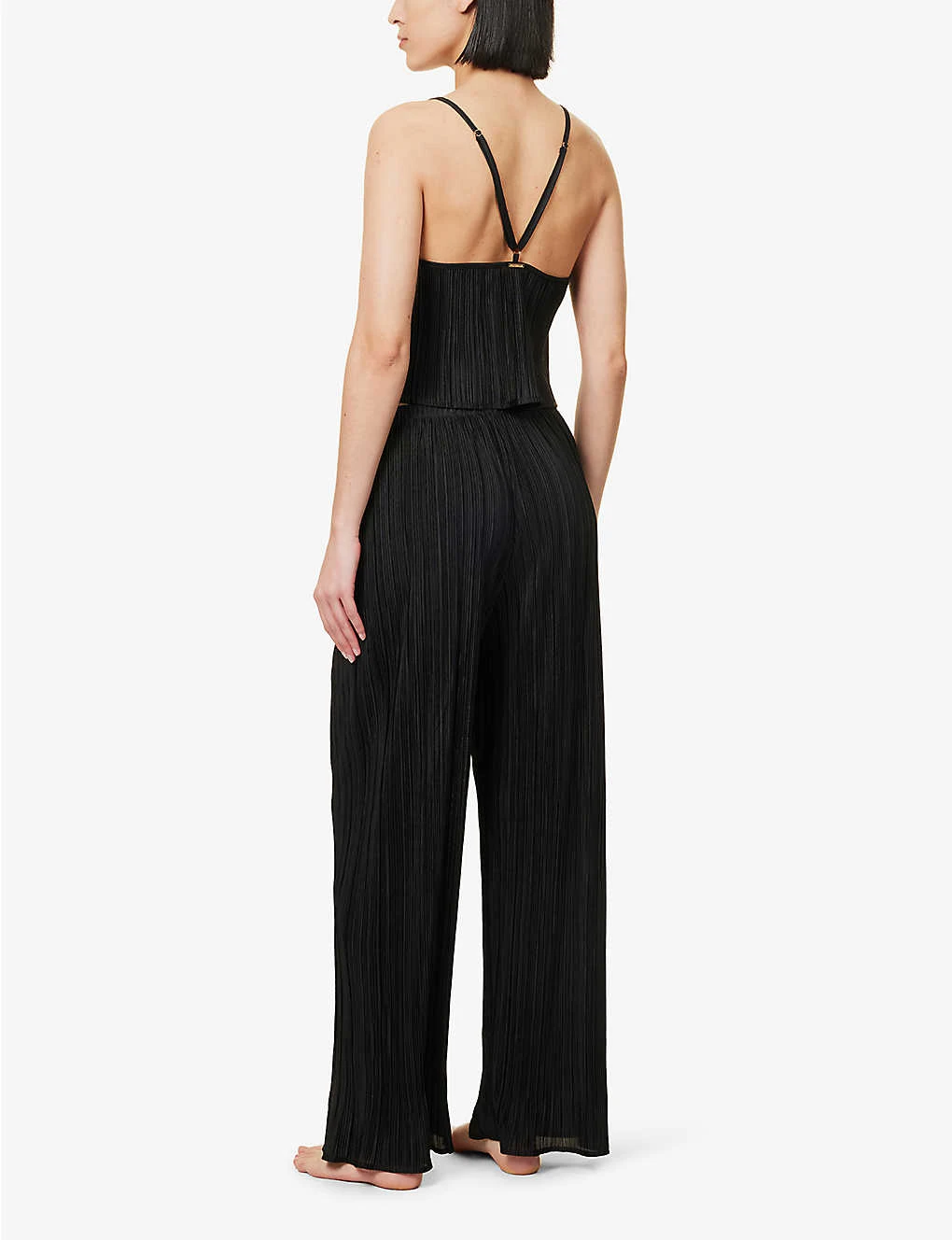 - Regular-fit, high-rise, wide leg, elasticated waistband, all-over plissé texture