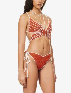 - Mid-rise, dipped waist at front, crochet-knit, medium coverage at back, contrast trims