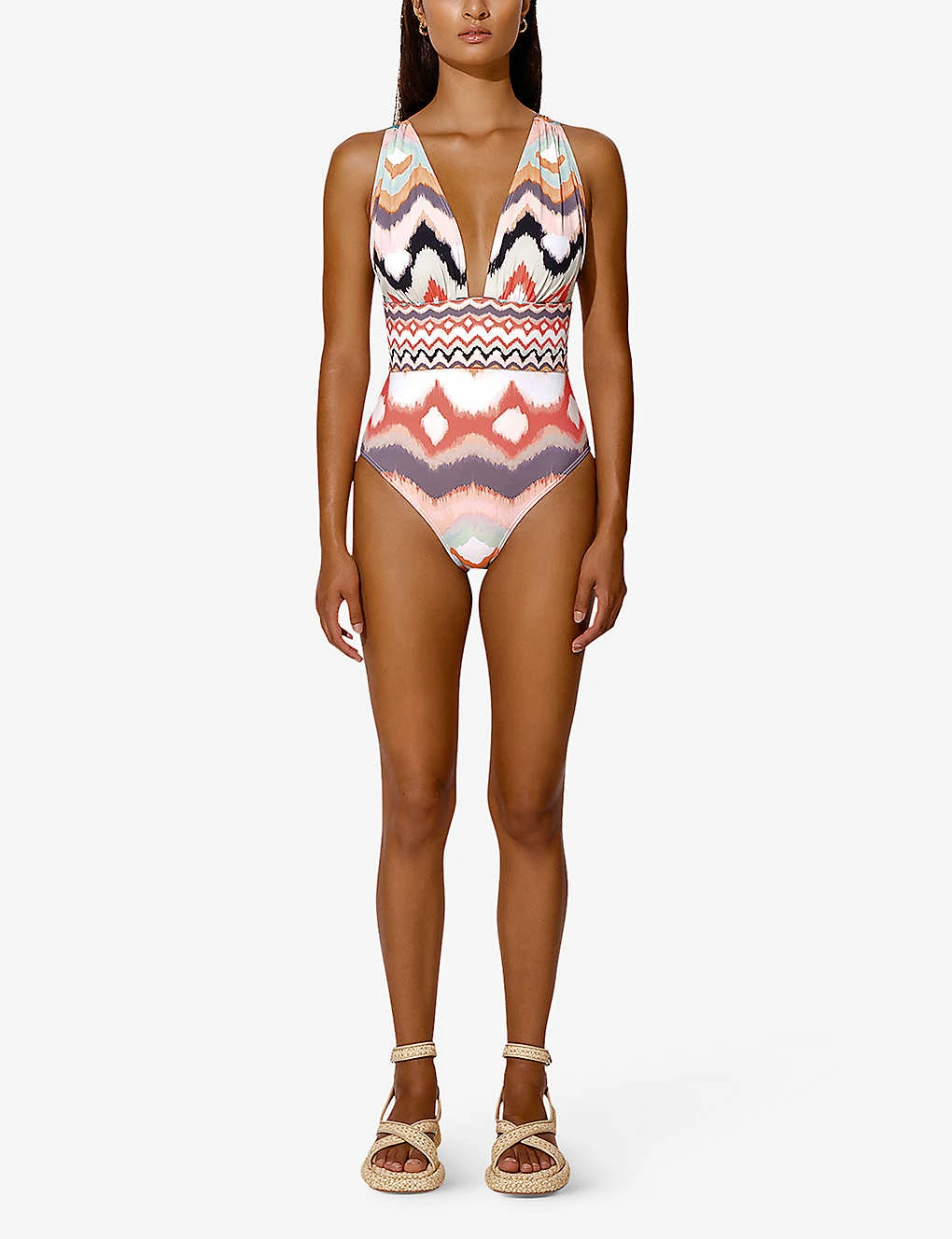 - Plunging V-neck, shoulder straps, fitted waist, open back, graphic-print, fully lined