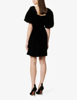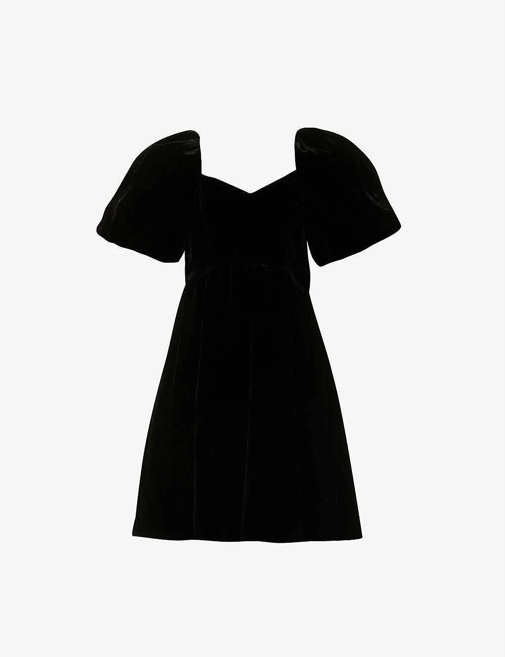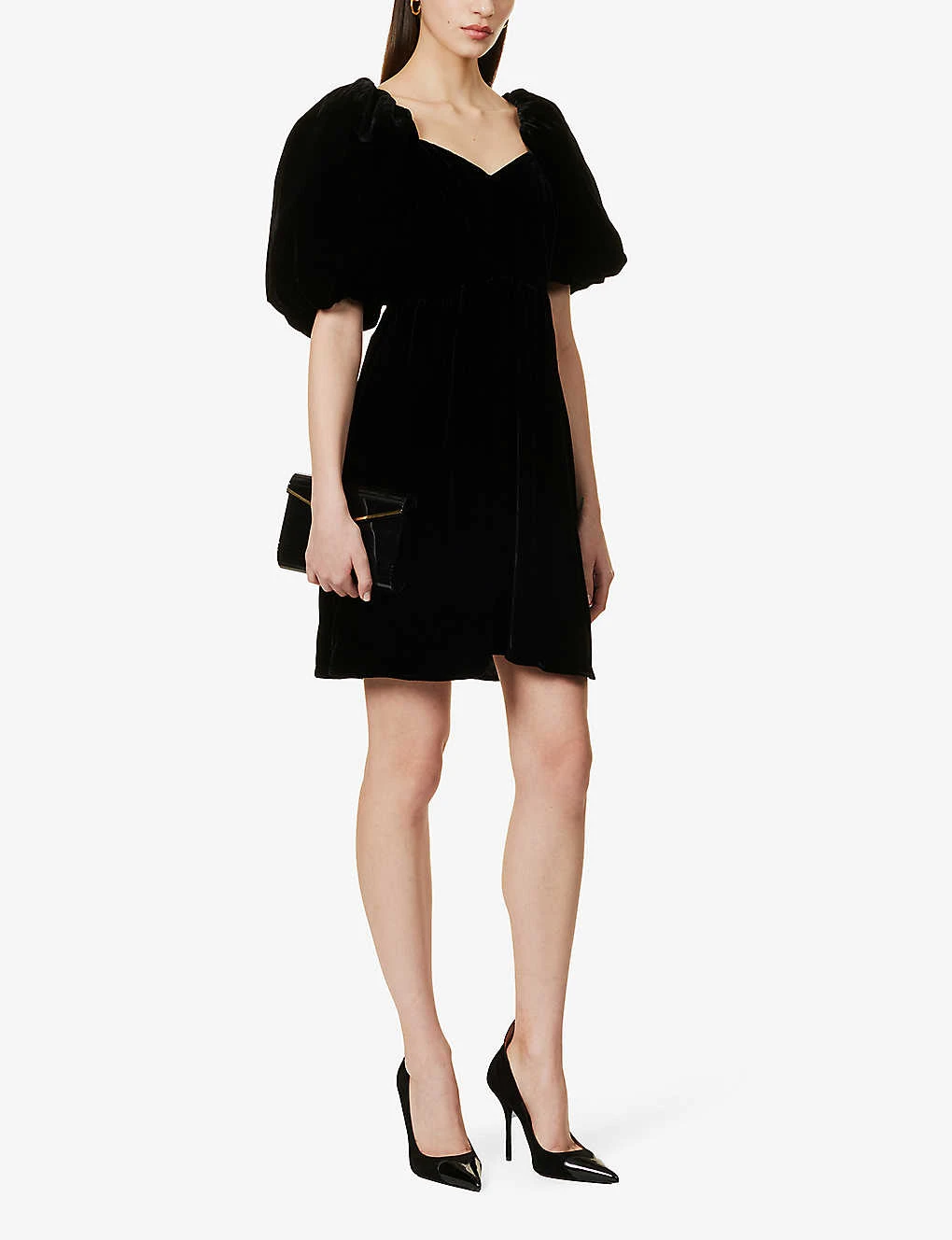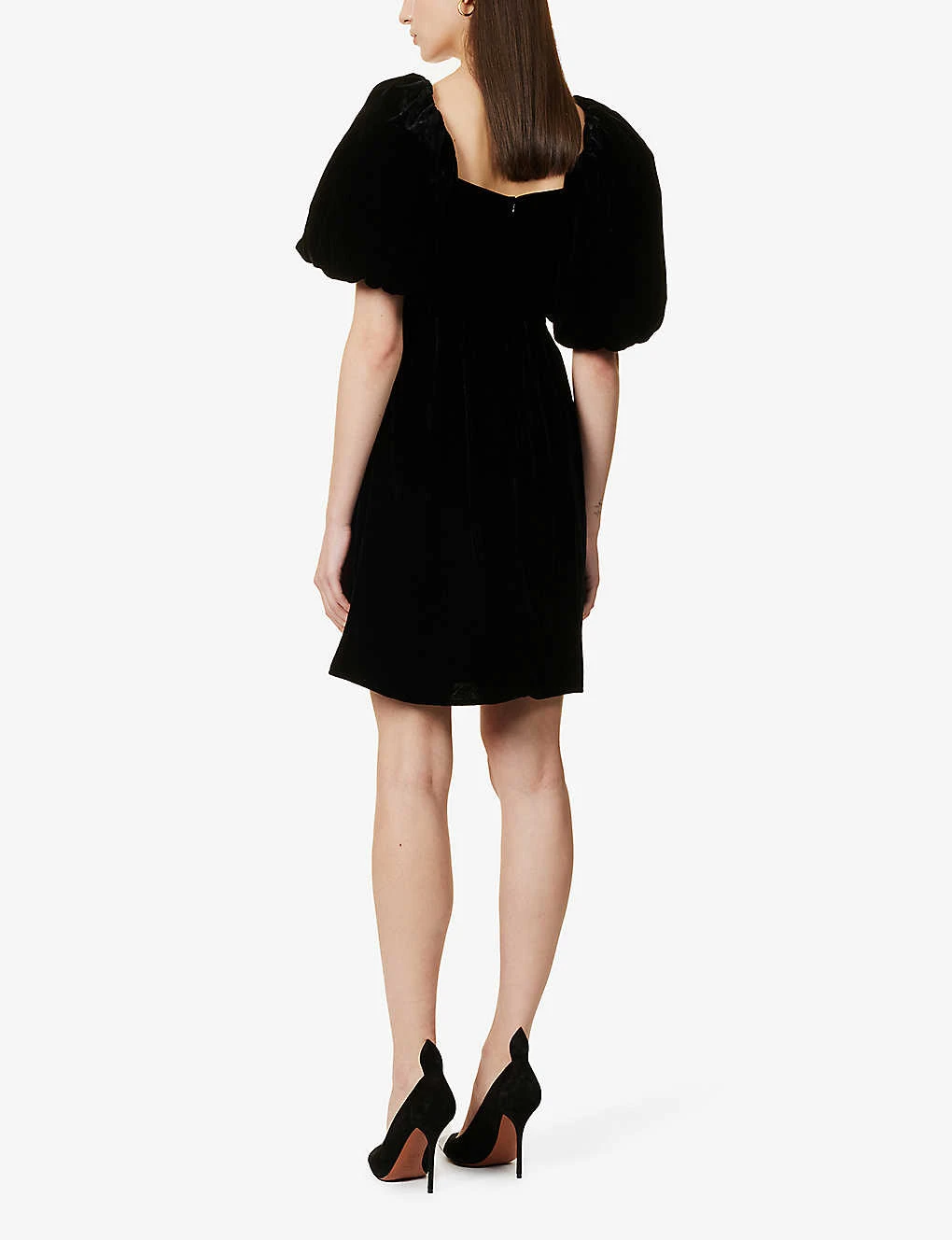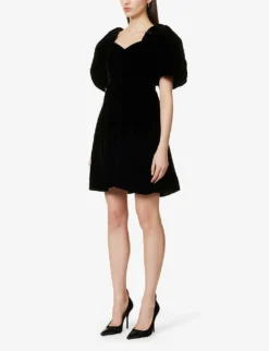 - Mini length, V- neck, puff sleeves, flared skirt, all-over velvet texture
