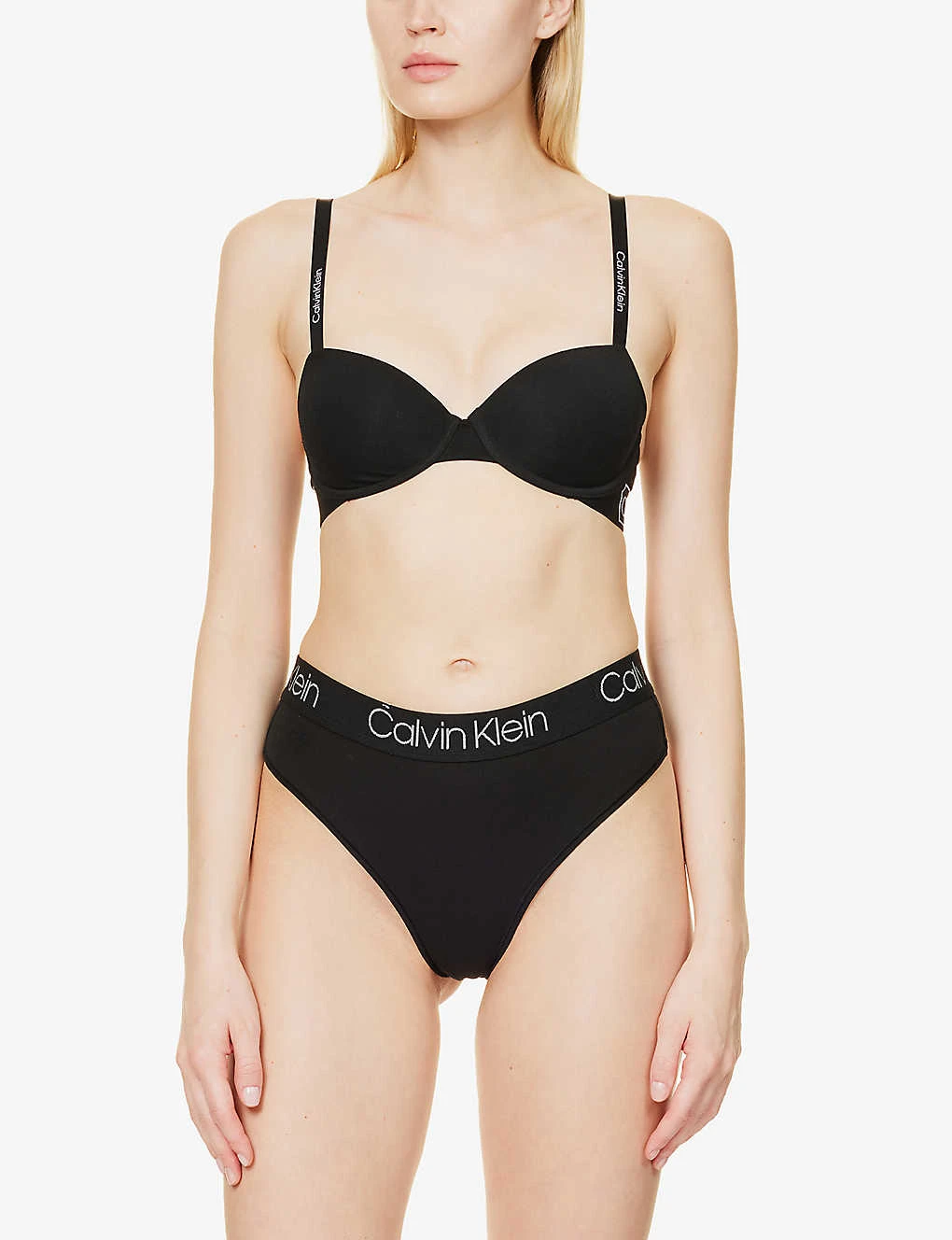 Calvin Klein stretch-cotton thongDetails:High riseBranded elasticated waistbandV-string at backCotton gussetSlips onFabric:95% cotton, 5% elastaneLightweight, slight stretchSize & Fit:True to sizeCut to a fitted silhouetteCare:Machine wash