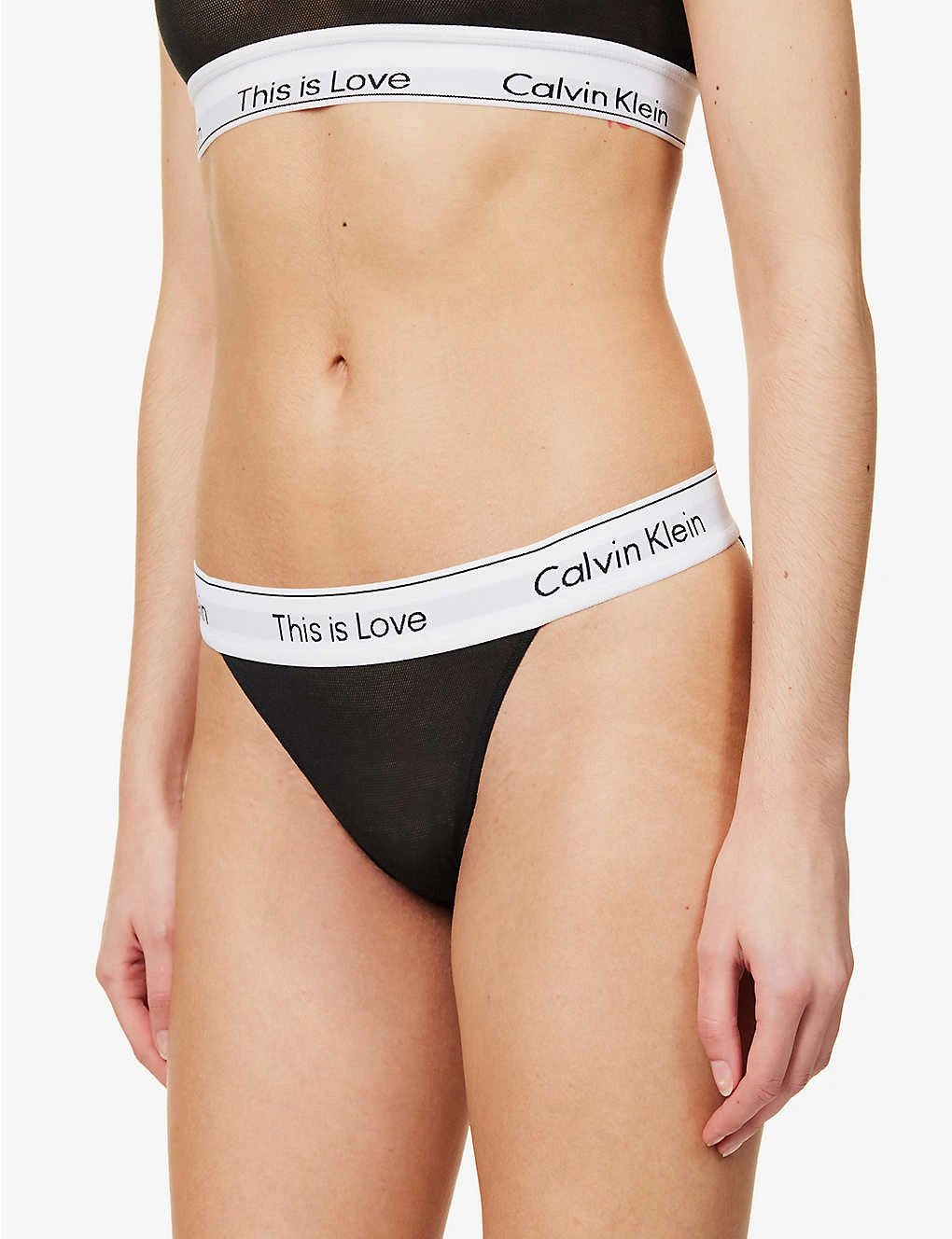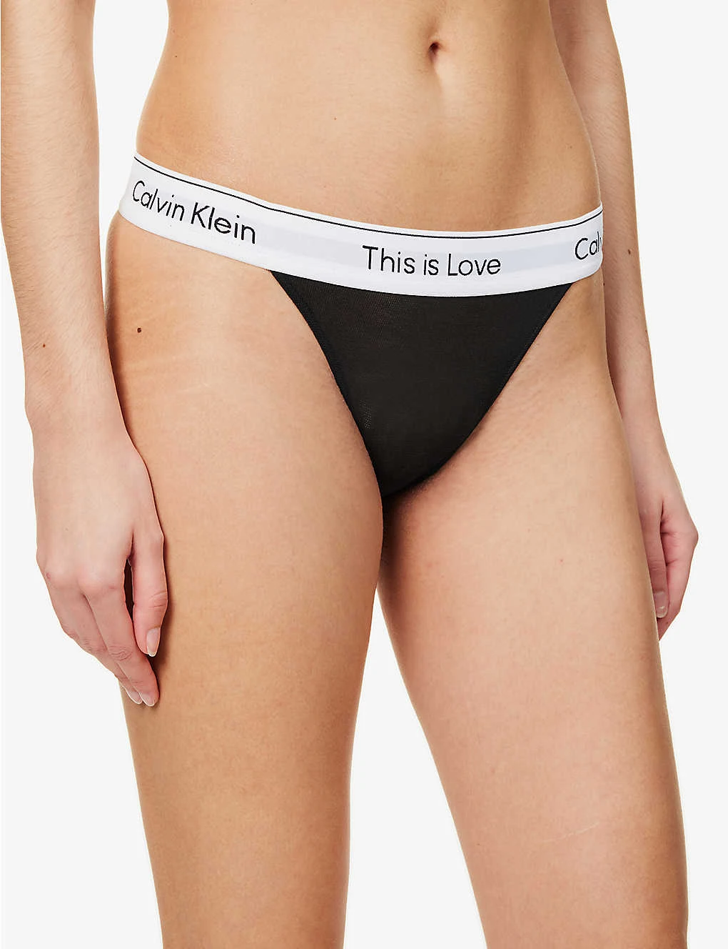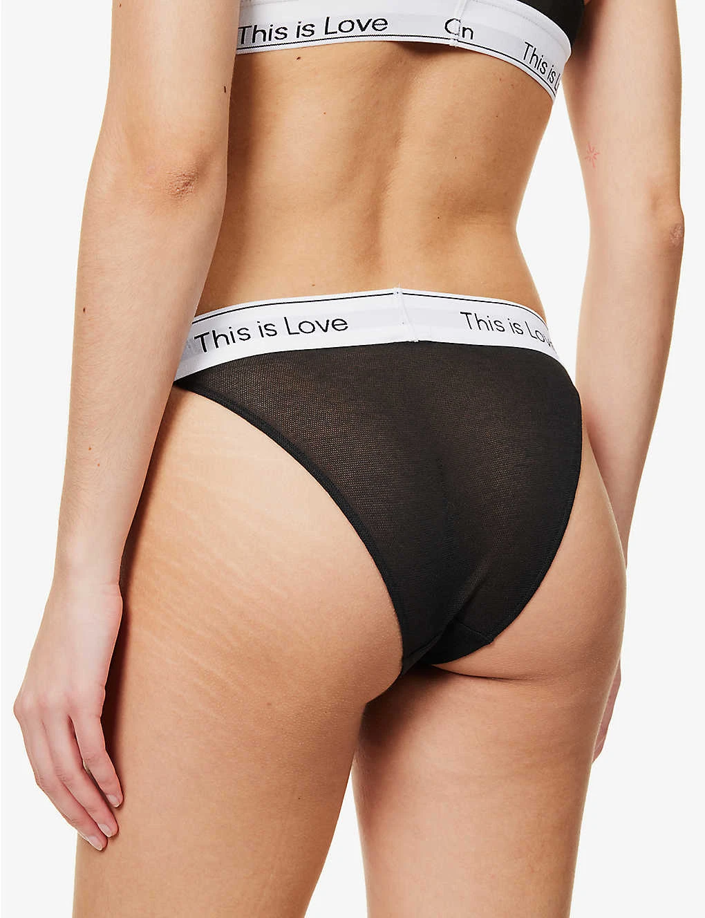 - Mid-rise, branded elasticated waistband, high leg, tanga style, all-over mesh texture