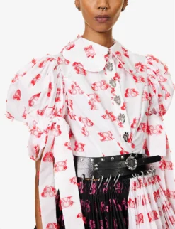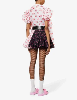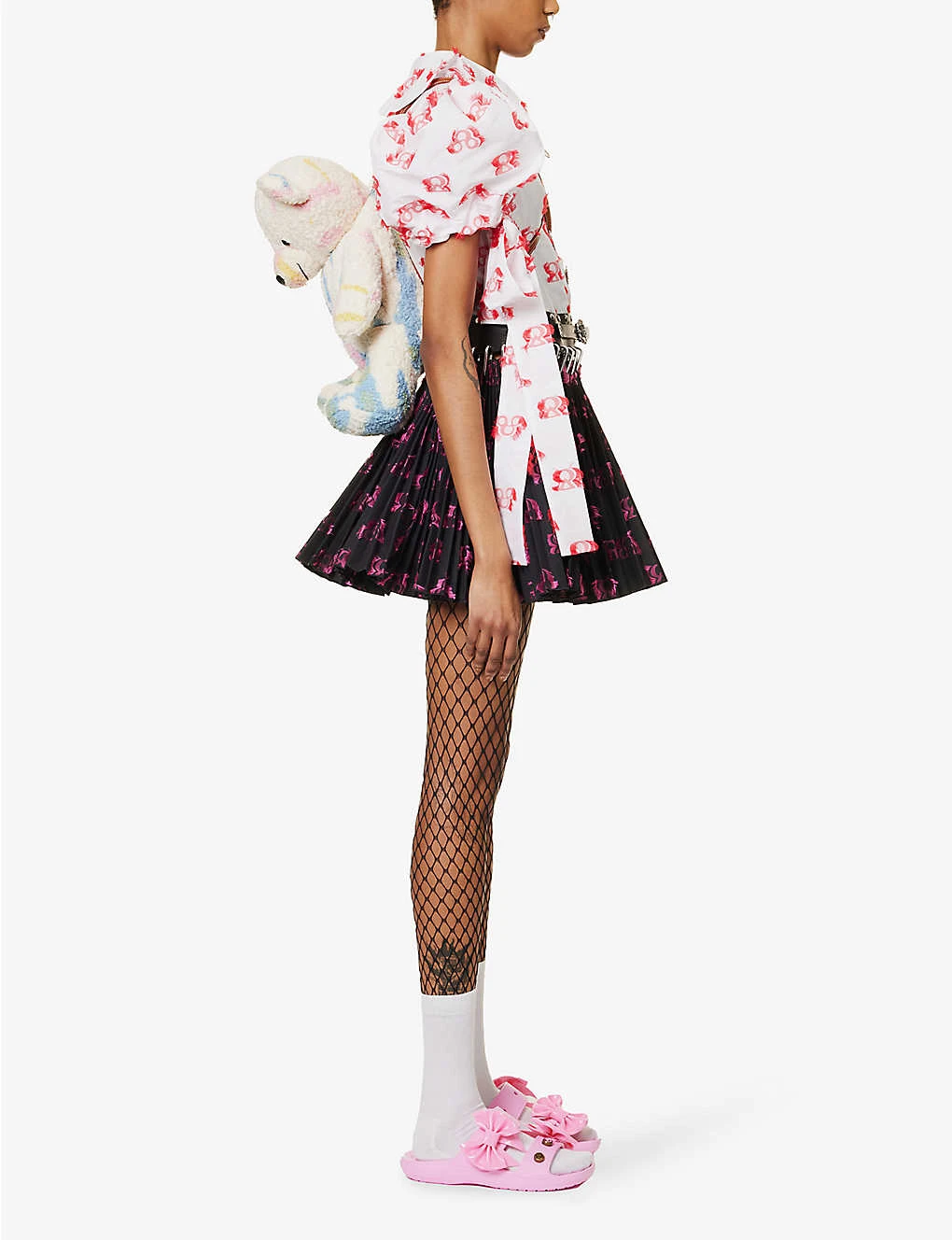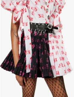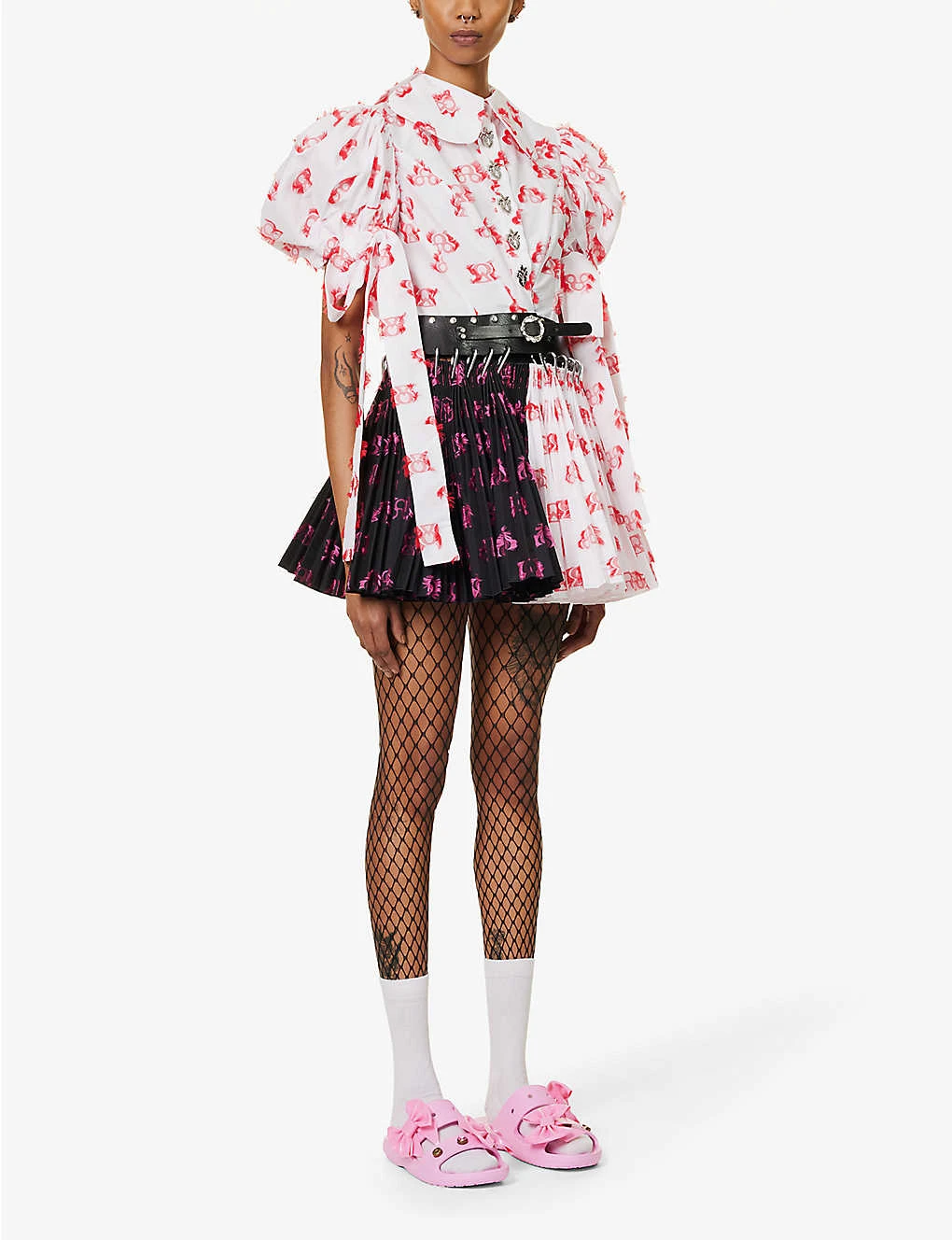 - Regular fit, collar, short puff sleeves, self-tie sleeve hems, contrast buckle belt at waist, colour block pattern, box pleat hem with carabiner clips, all-over frayed jacquard pattern, flared hem