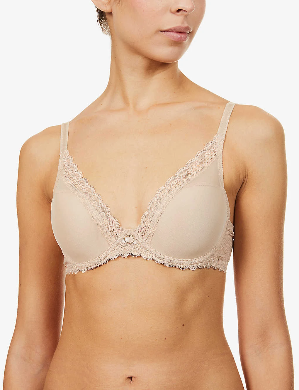 - Plunge v-neck, adjustable straps, lace trims, padded and moulded cups, underwired, gold-toned hardware, brand plaque at side