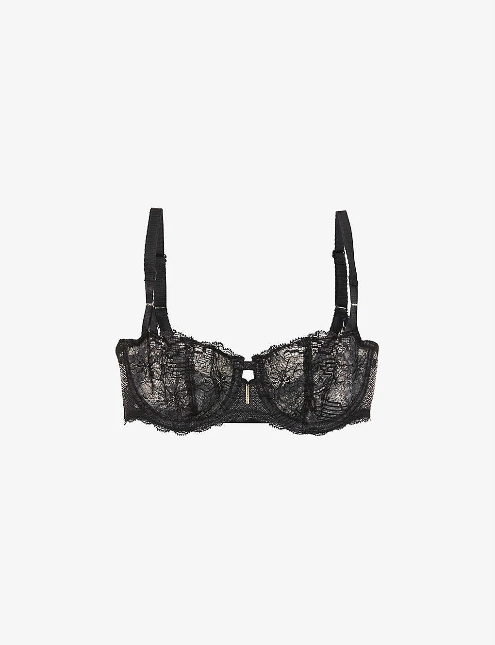 - Half cup silhouette, adjustable shoulder straps, underwired, all-over floral lace