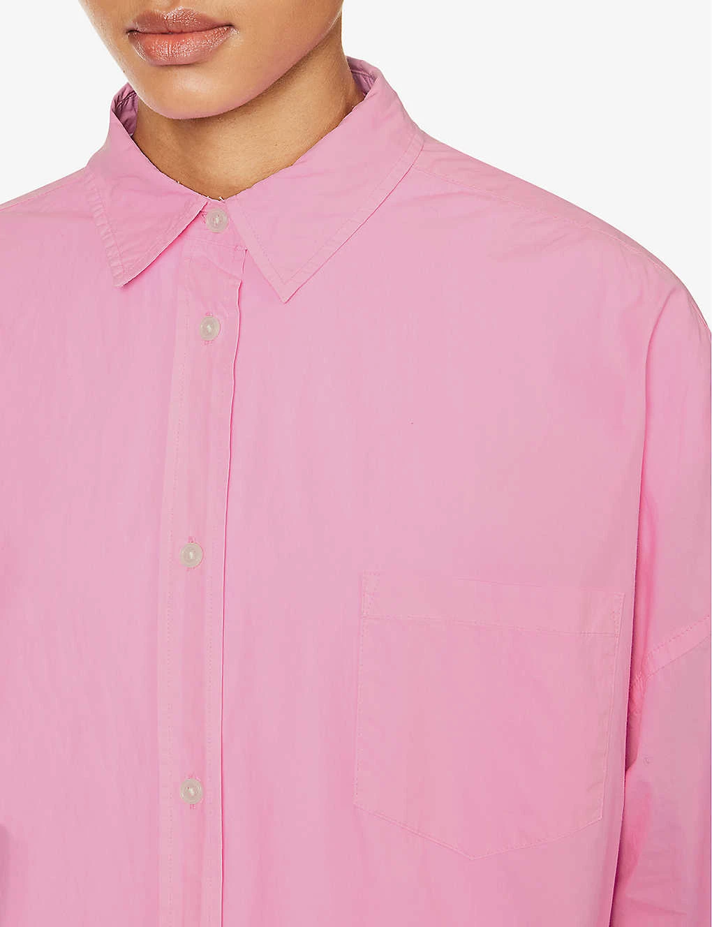 - Relaxed fit, collar, dropped shoulders, long sleeves, pleated buttoned cuffs, patch pocket at chest, box pleat at back, pearlescent buttons, dipped hem at back