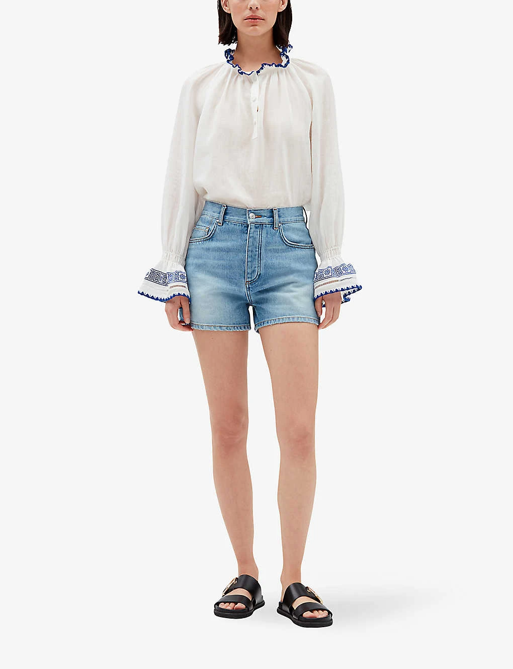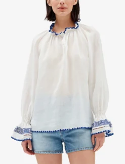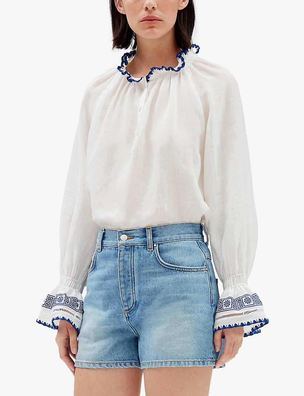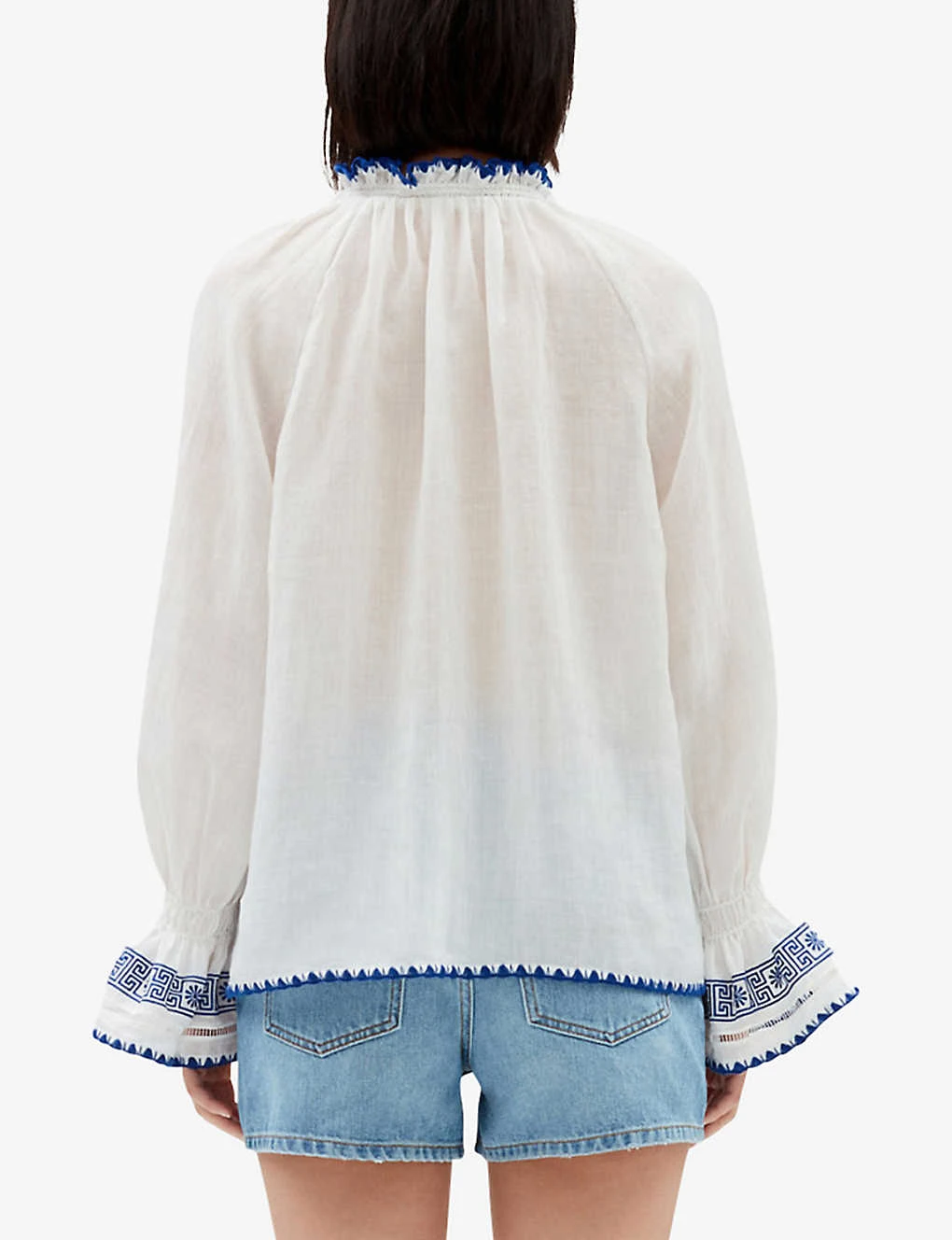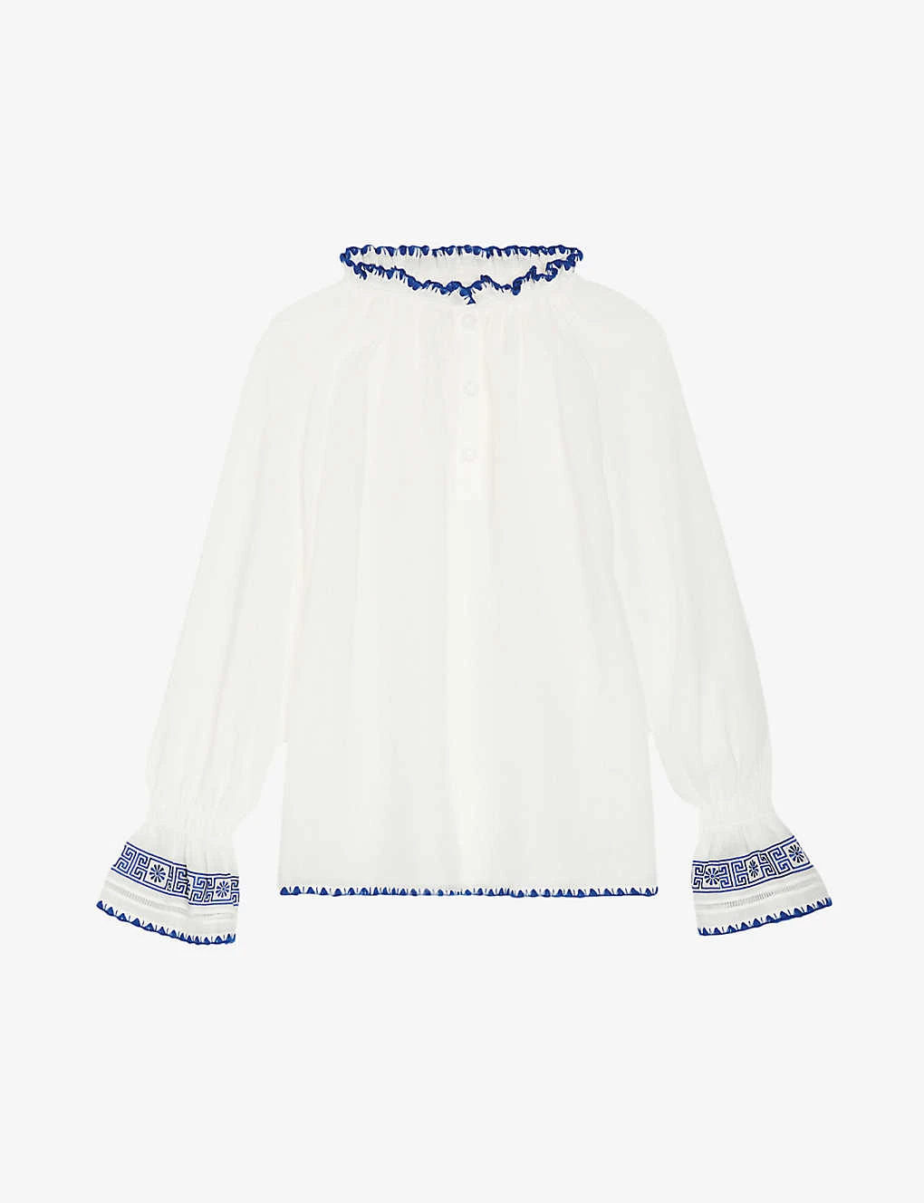 - Relaxed fit, high ruffle neck, exposed button placket at front, long sleeves, ruffled cuffs, contrast embroidery at neckline. cuffs and hem