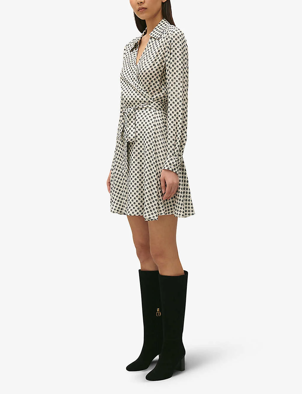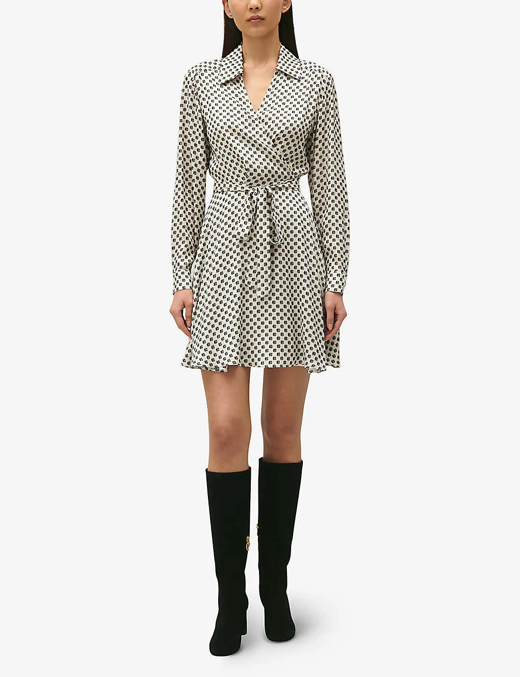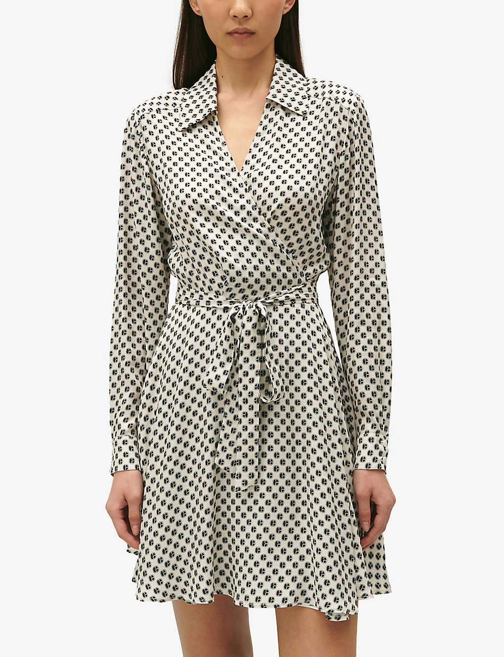 - Slim fit, V-neck, collar, wrap front, long sleeves, self-tie fastening at waistband, flared skirt, all-over monogram print, straight hem, partially lined