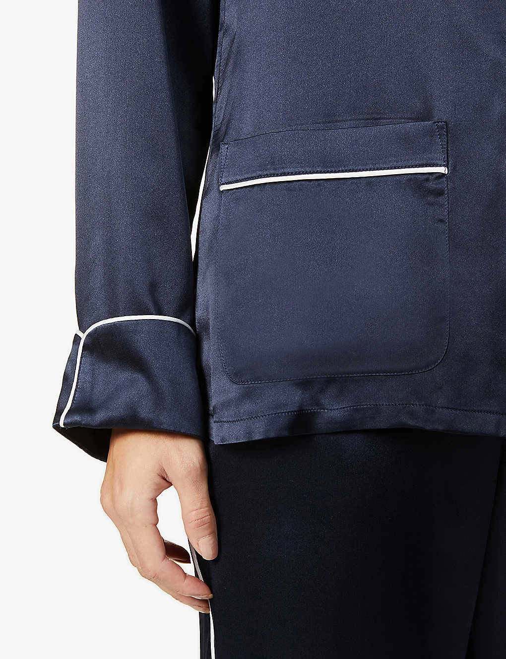 - Camp collar, long sleeves, one patch pocket at chest, two patch pockets at front, pearlescent buttons, contrast piping