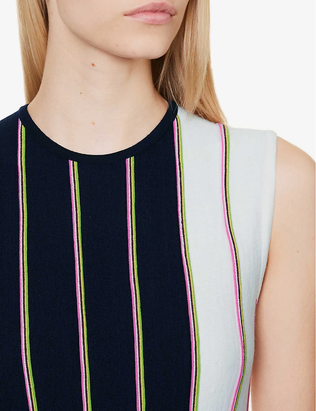 - Slim fit, round neck, sleeveless, medium knit, all-over striped pattern, ribbed trims, flared hem