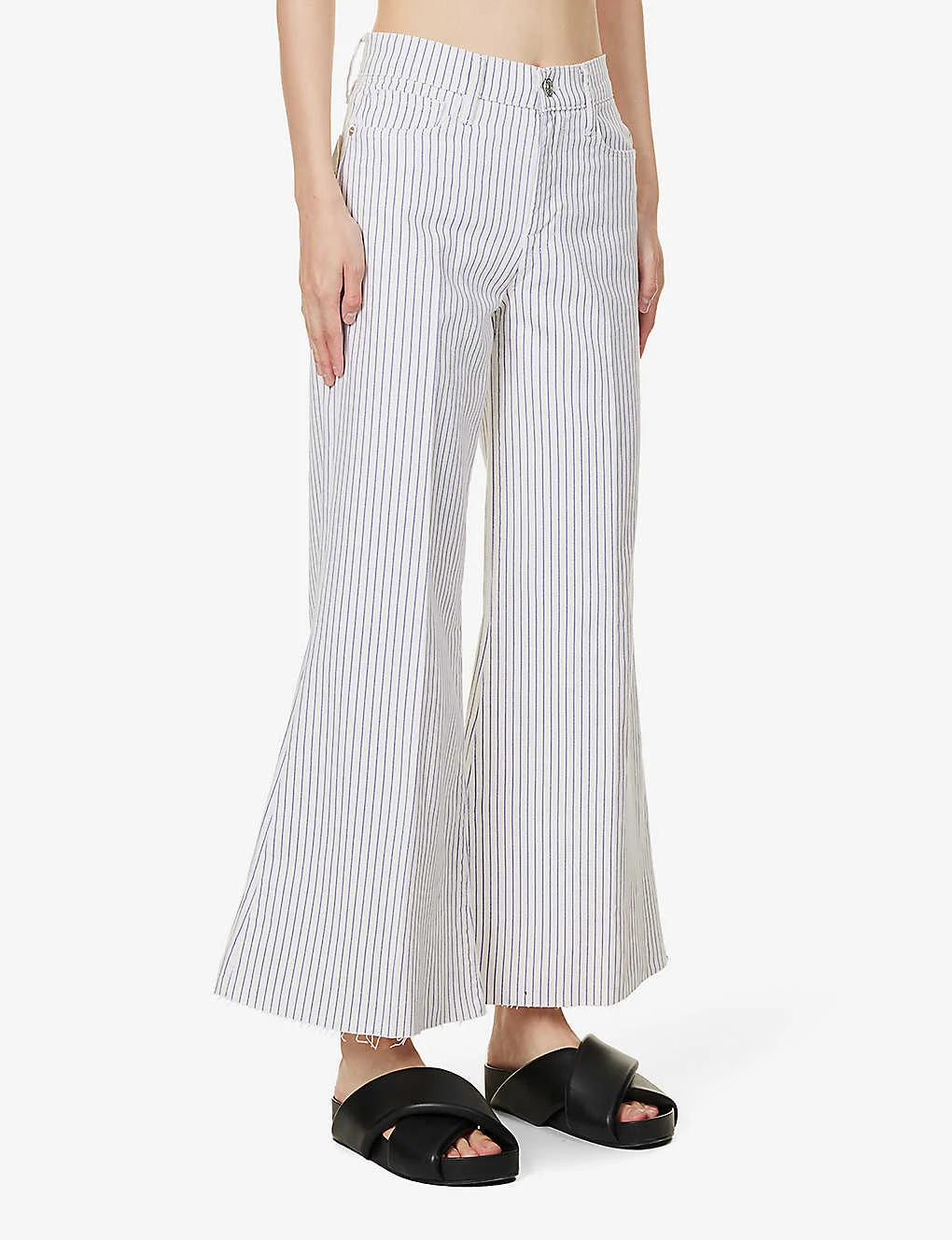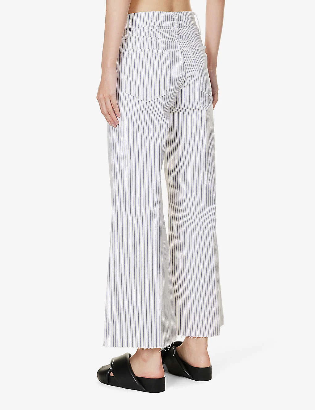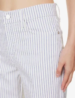 - Regular fit, mid-rise, cropped wide leg, structured waistband with belt loops, five pockets, curved yoke at back, all-over stripe pattern, branded silver-toned hardware, raw hems