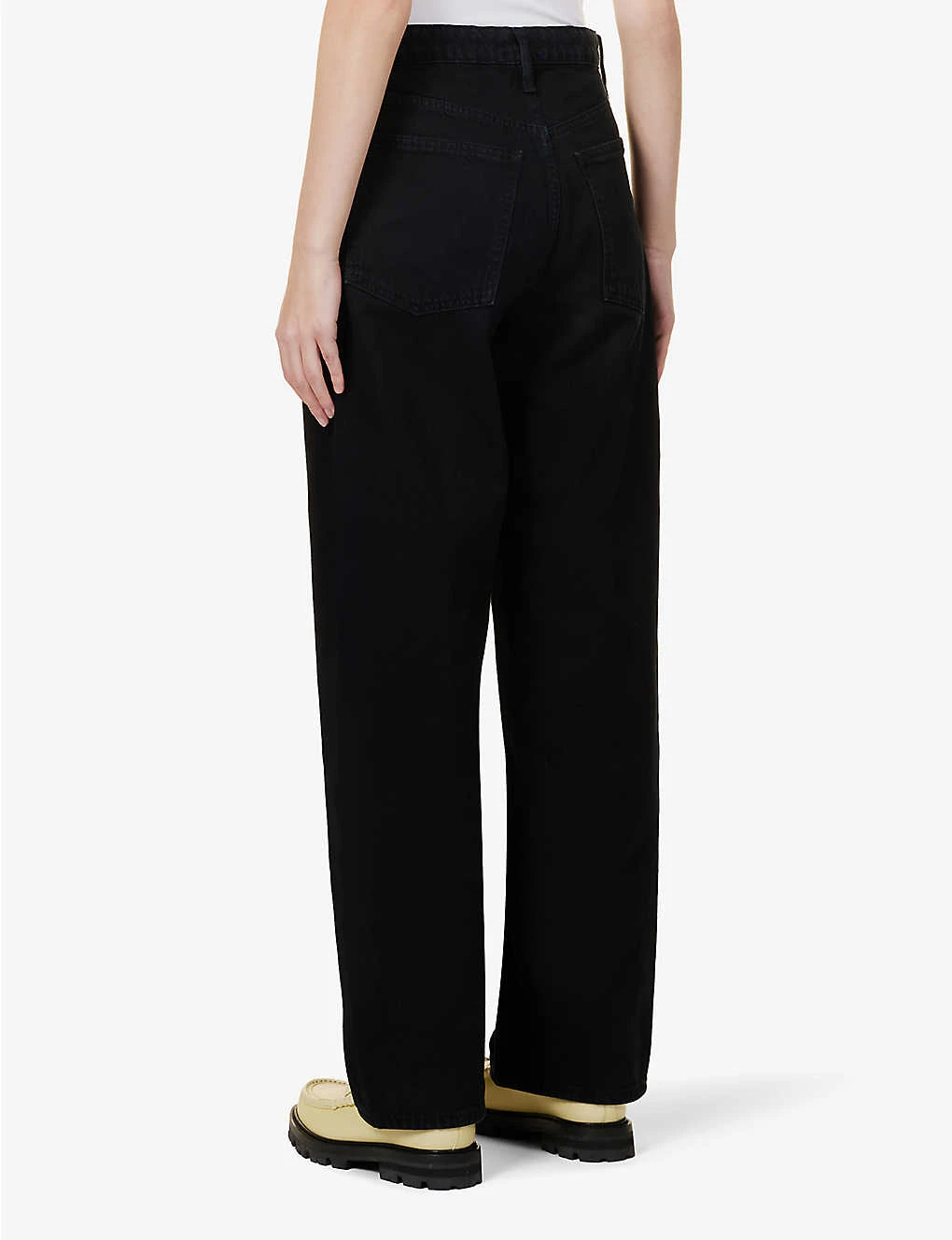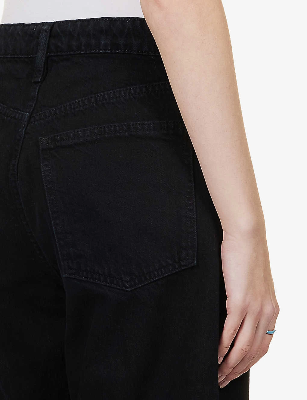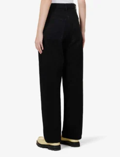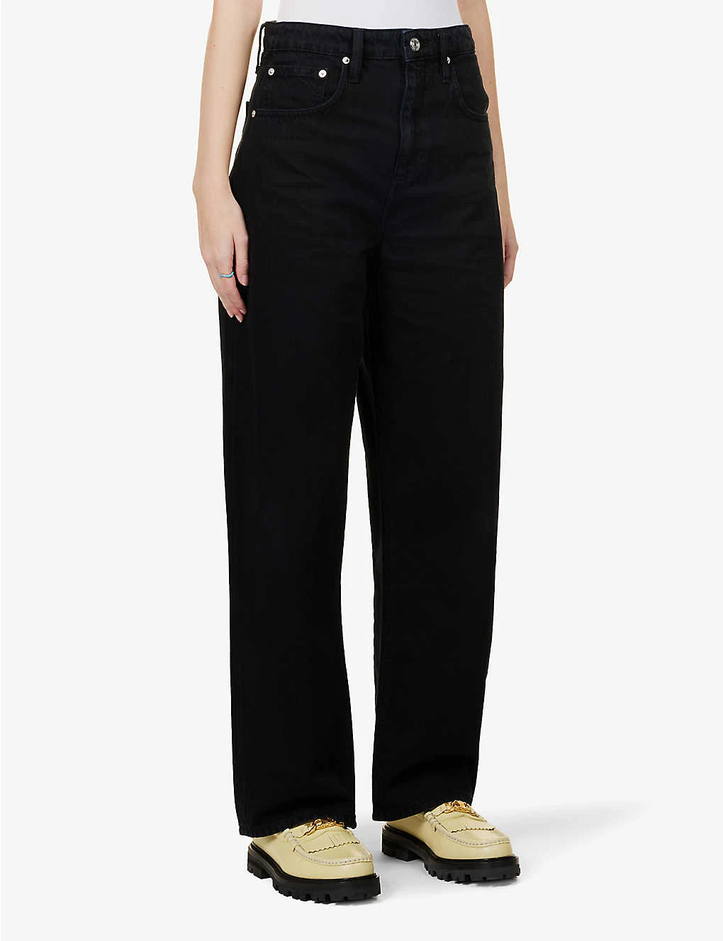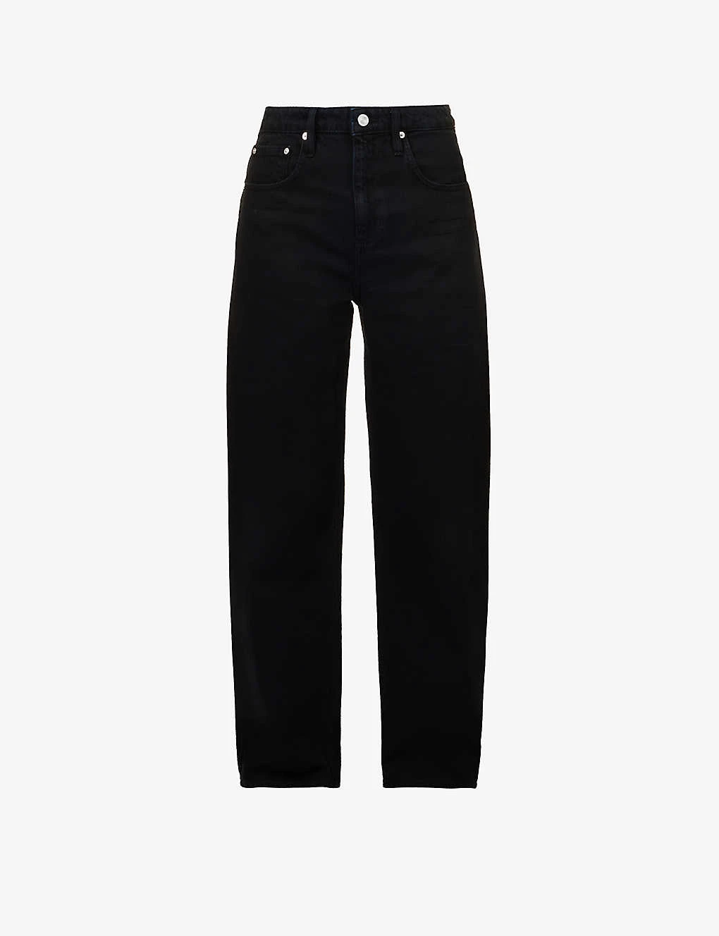 - Exposed button and concealed zip-fly fastenings at front