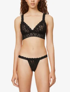 - High rise, high leg, elasticated lace waistband, two bow embellishments at front waist, embroidered at front, V-string at back, lined gusset