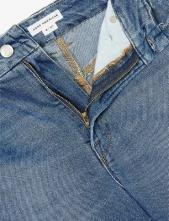 - Regular-fit, high-rise, straight leg, belt loops, silver-toned hardware, all-over faded wash and whiskering, contrast stitching, V-shaped yoke at back, partially lined, raw hems