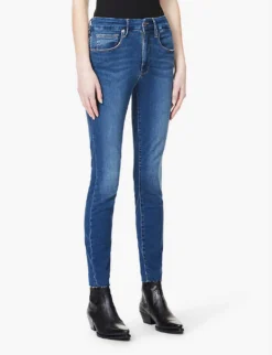 - Slim fit, high rise, skinny, belt loops, five pockets, branded hardware, faded wash and whiskering, V-shaped yoke at back, raw hem at cuffs