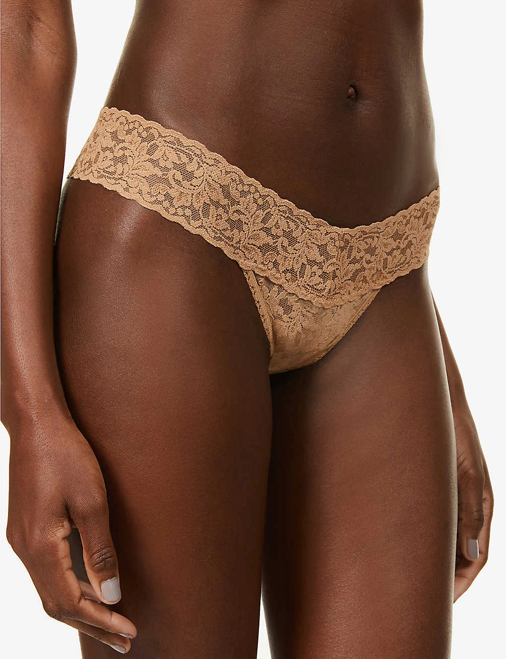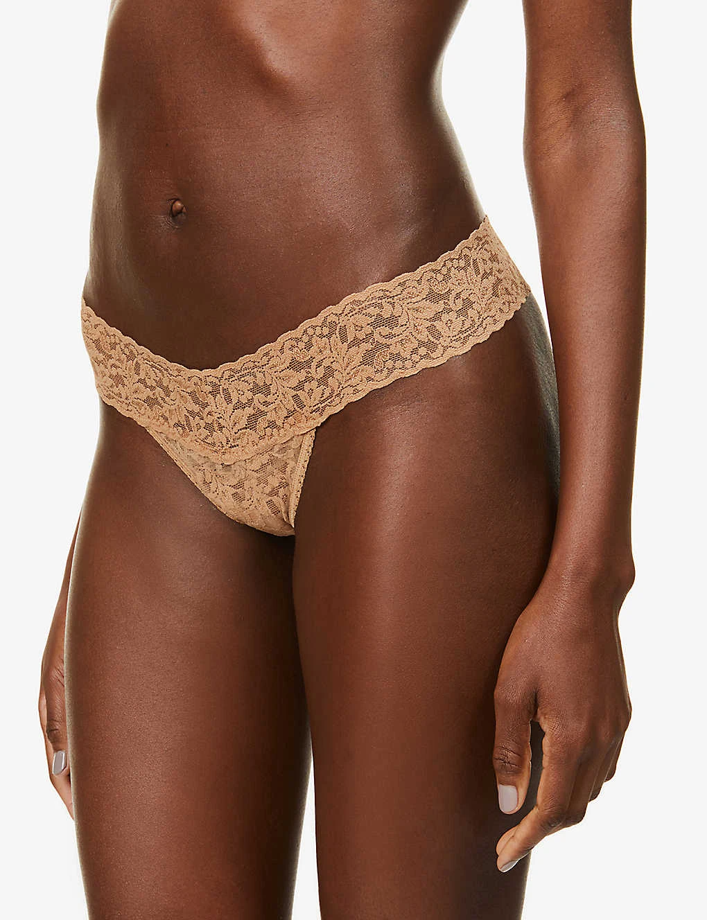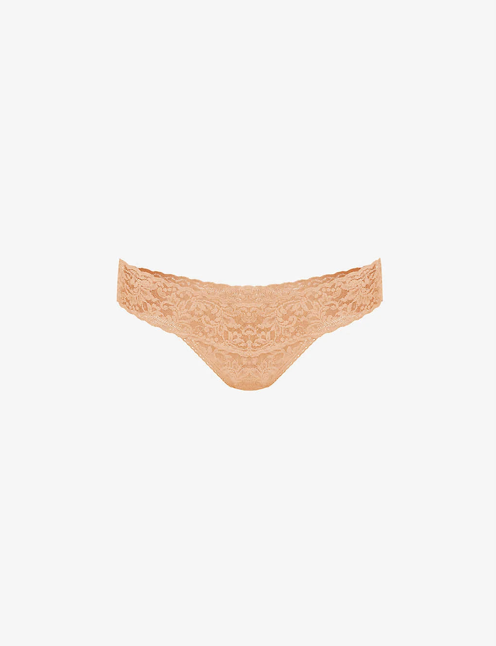 - Low rise, elasticated waistband, all-over lace pattern, V-string at back, cotton gusset
