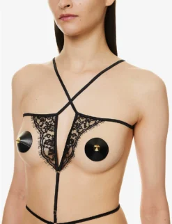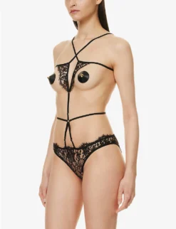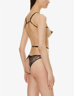 - Regular-fit, round neck, shoulder straps, gold-toned hardware, elasticated waistband, all-over semi-sheer floral lace panels, scalloped trims, open gusset