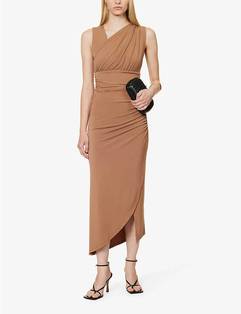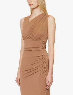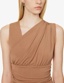 - Slim fit, V-neckline, sleeveless, ruching at shoulder, sides and back, mid-coverage at back, pressed-stud fastening at gusset