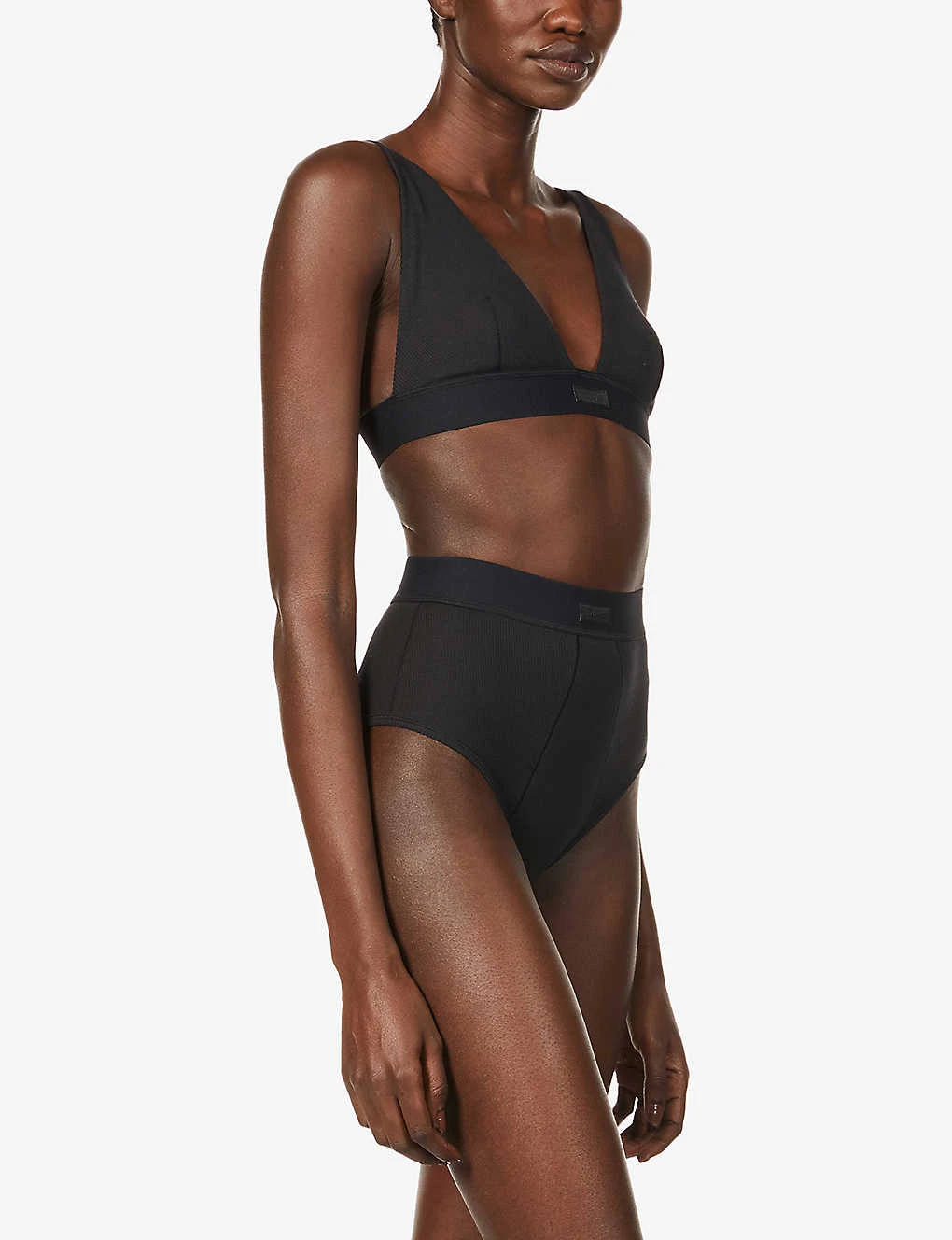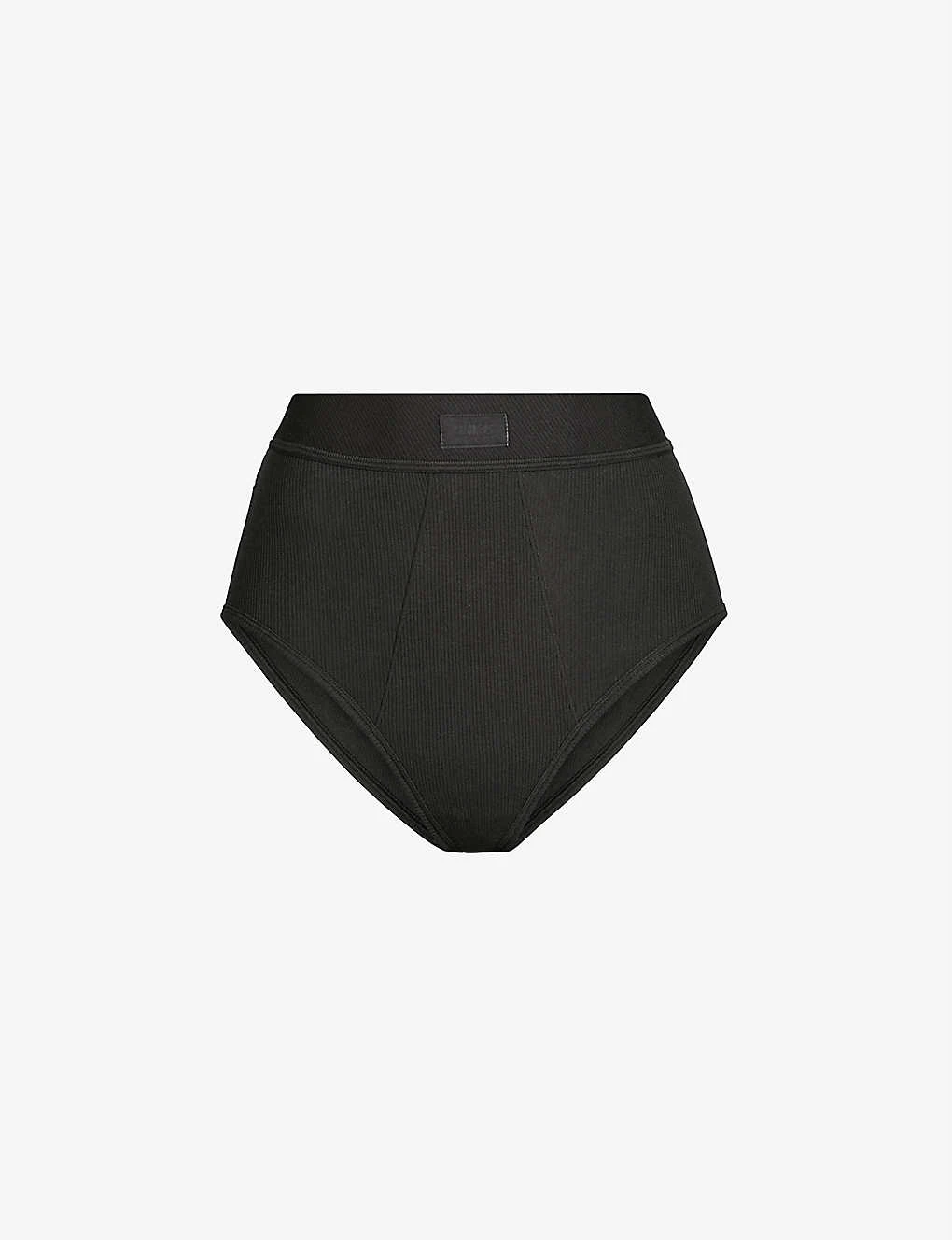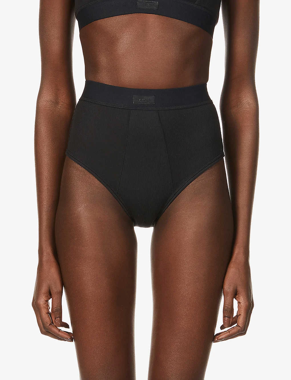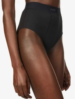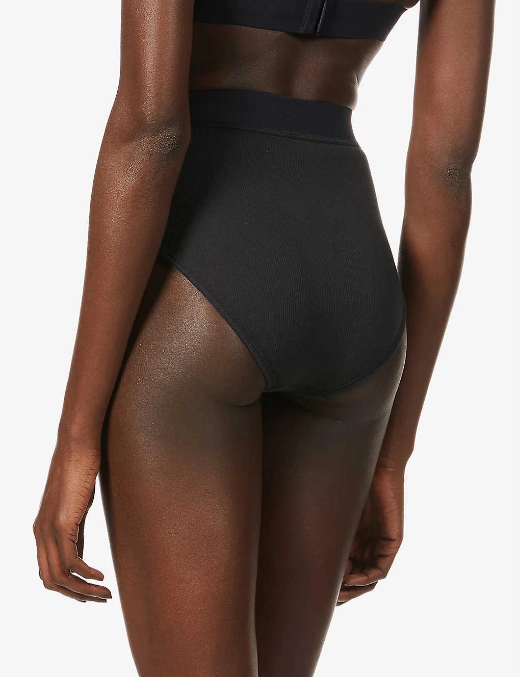 - High rise, elasticated waistband, woven brand patch at front waistband, high legs, medium coverage at back, all-over ribbed texture