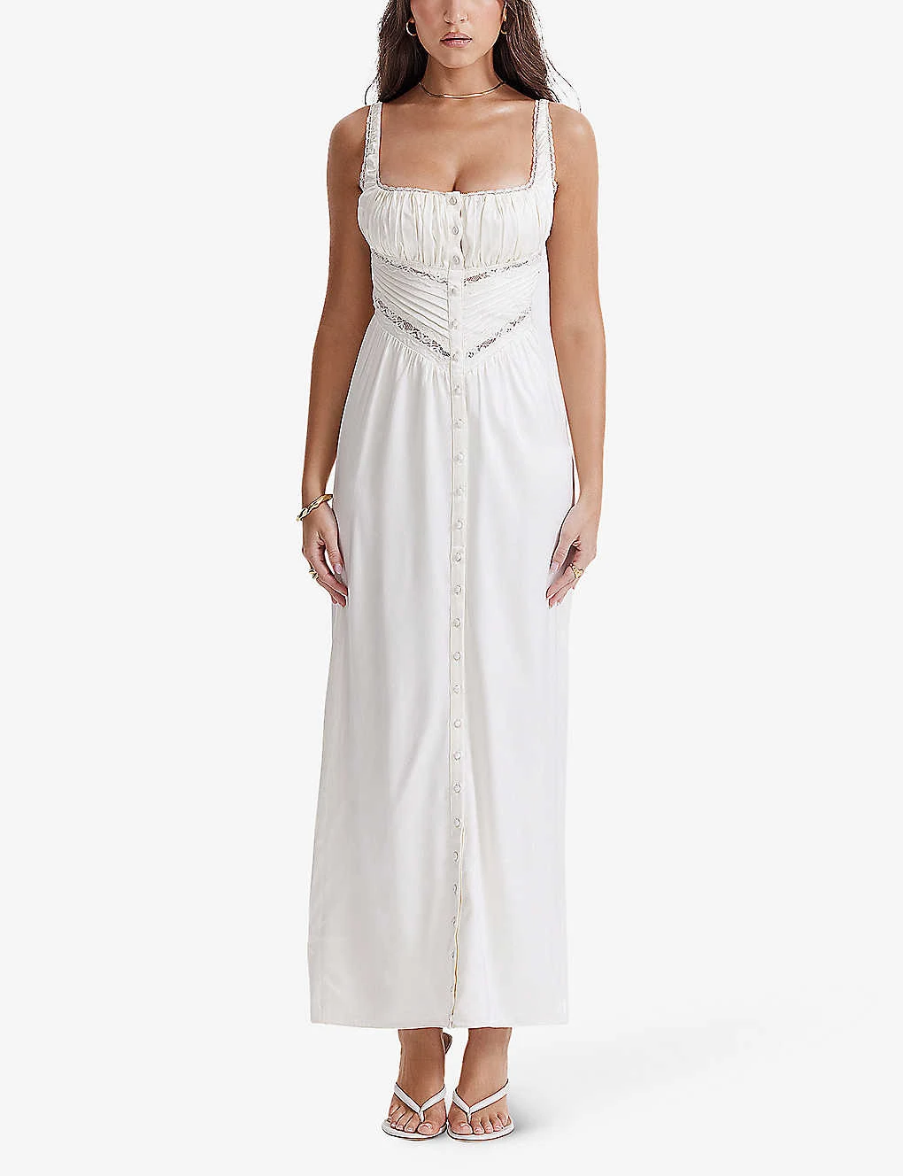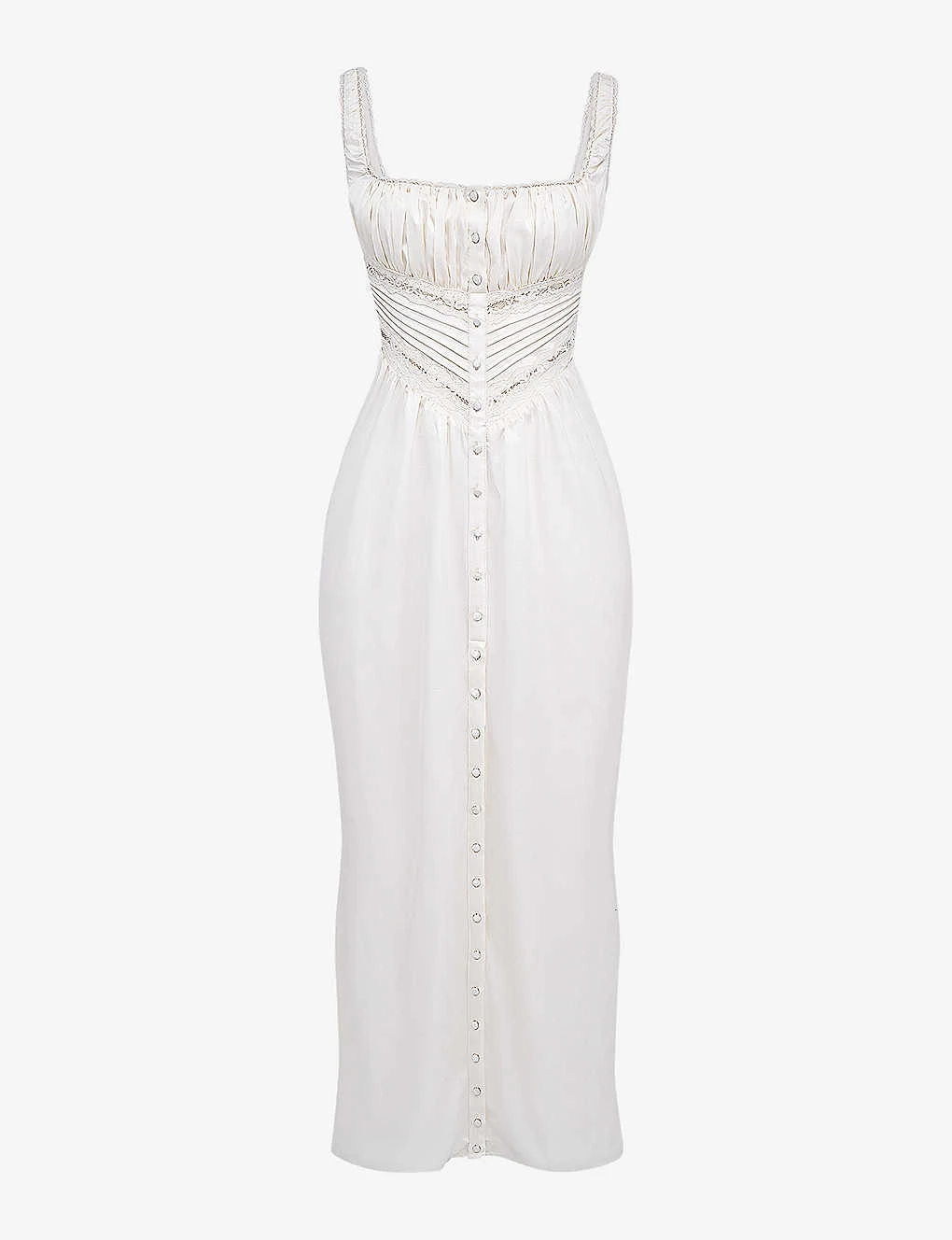 - Thick straps, sleeveless, square neckline, scalloped trim, bodice top, button-down detail, maxi length