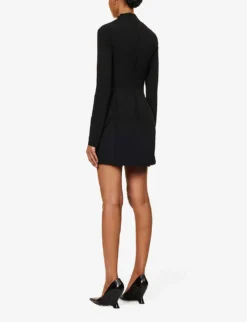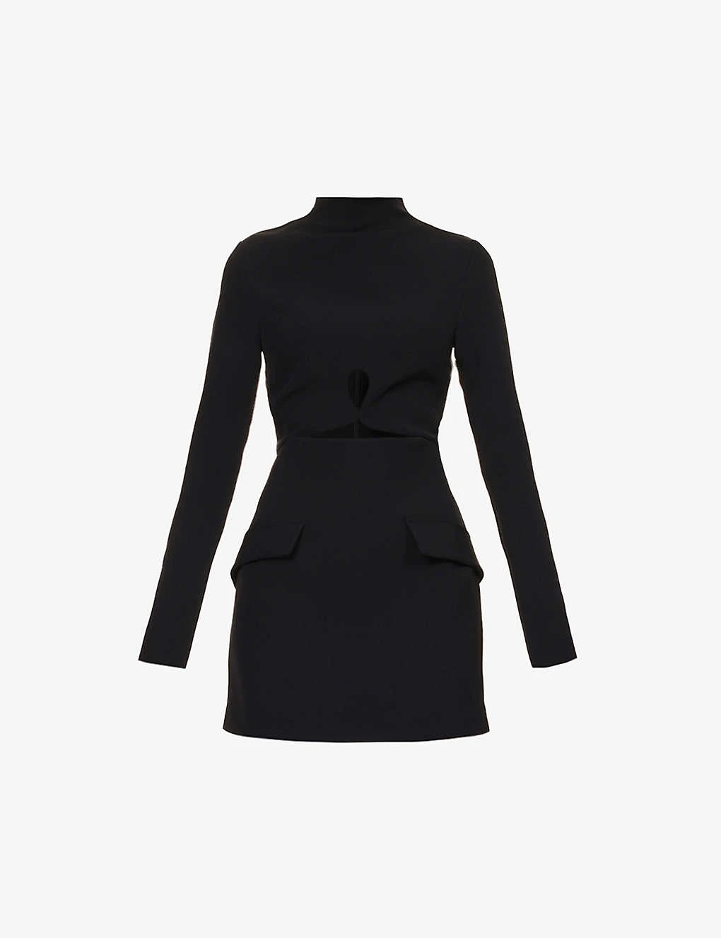 - Regular fit, high neck, long sleeves, but-out panels at bodice, darts at front, two faux flap pockets at front, A-line skirt, fully lined