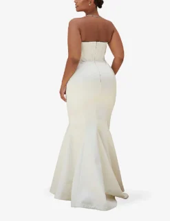 - Slim fit, sweetheart neckline, strapless, corseted bodice, fully lined, godet train
