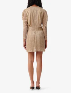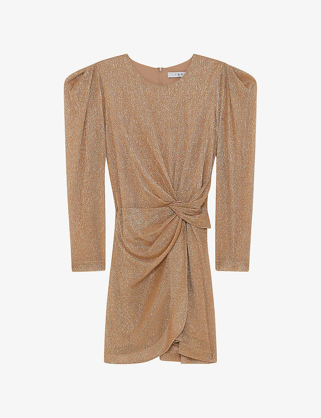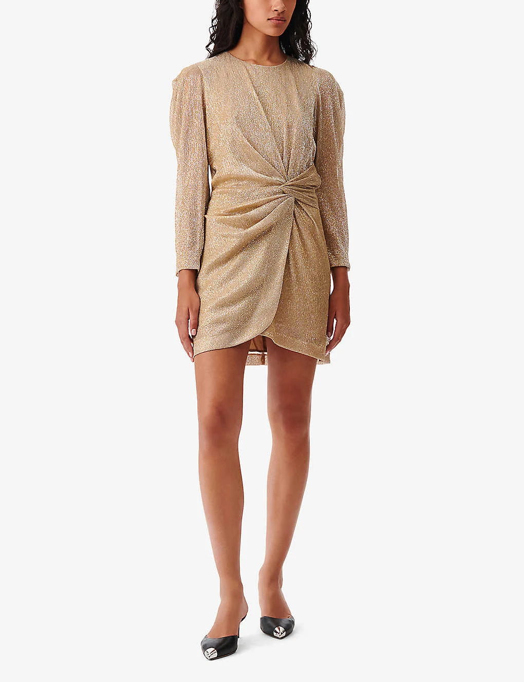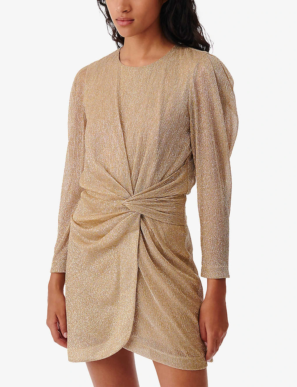 - Round neck, long sleeves, knot-tie detail at front, all-over metallic effect, mini length