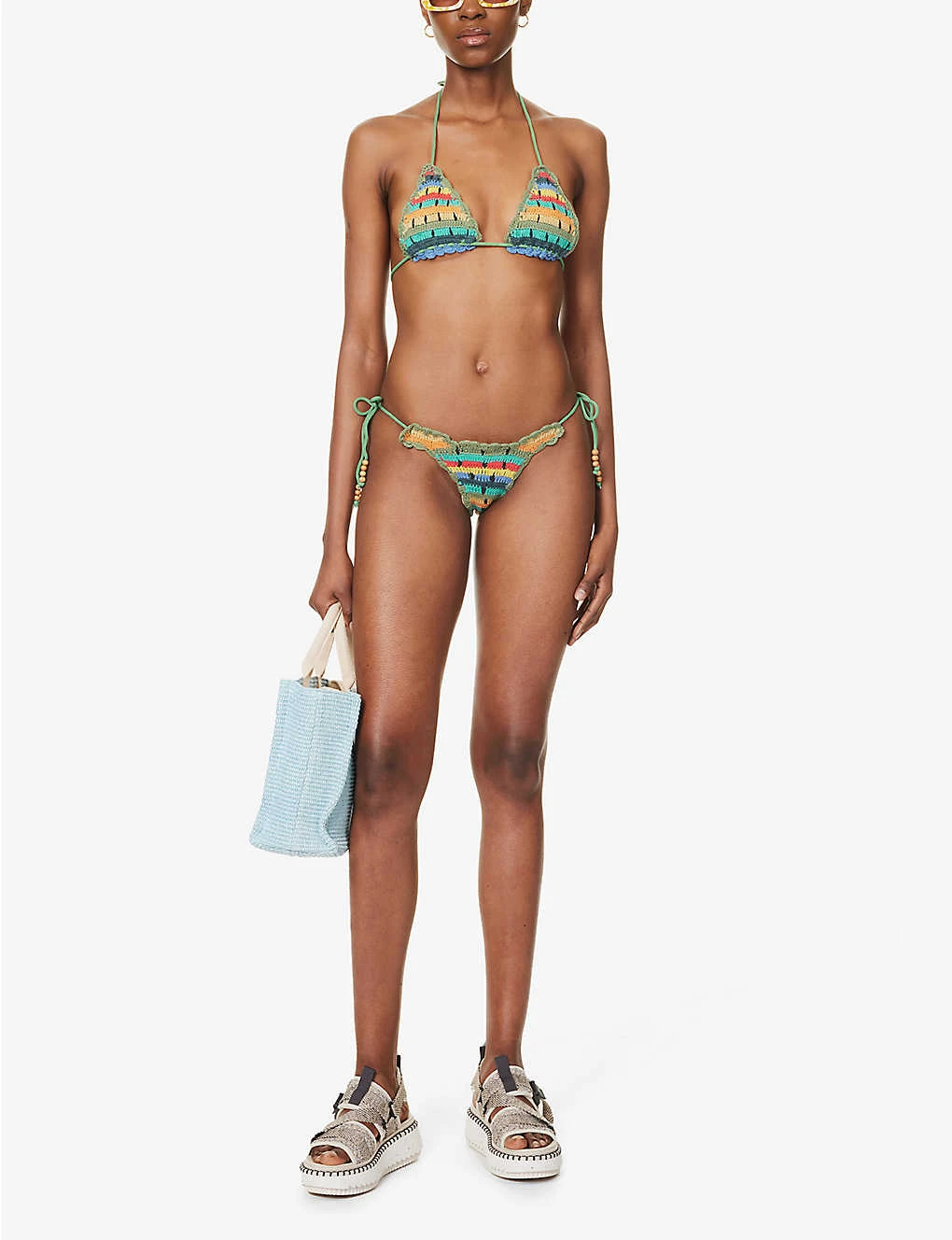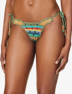 - Mid-rise, high leg, self-tie with beads at sides, all-over crochet knit design, stripe pattern, scallop trims