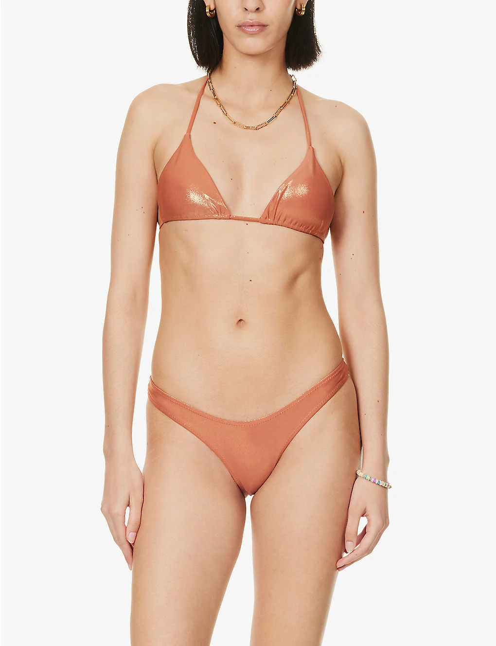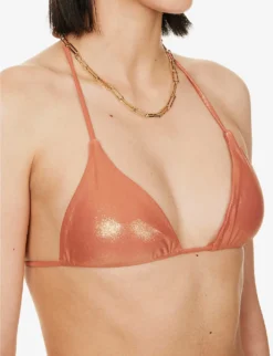 - Halter-neck, triangle cups, detachable padding, metallic finish, lined